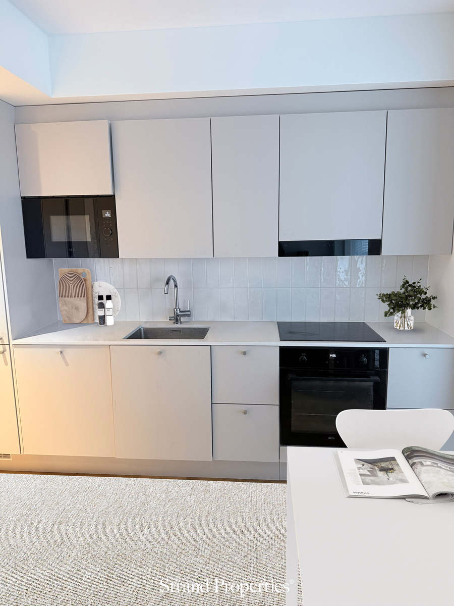 Vaaleassa keittiössä on kivitaso, trendikäs laatoitus sekä integroidut kodinkoneet.