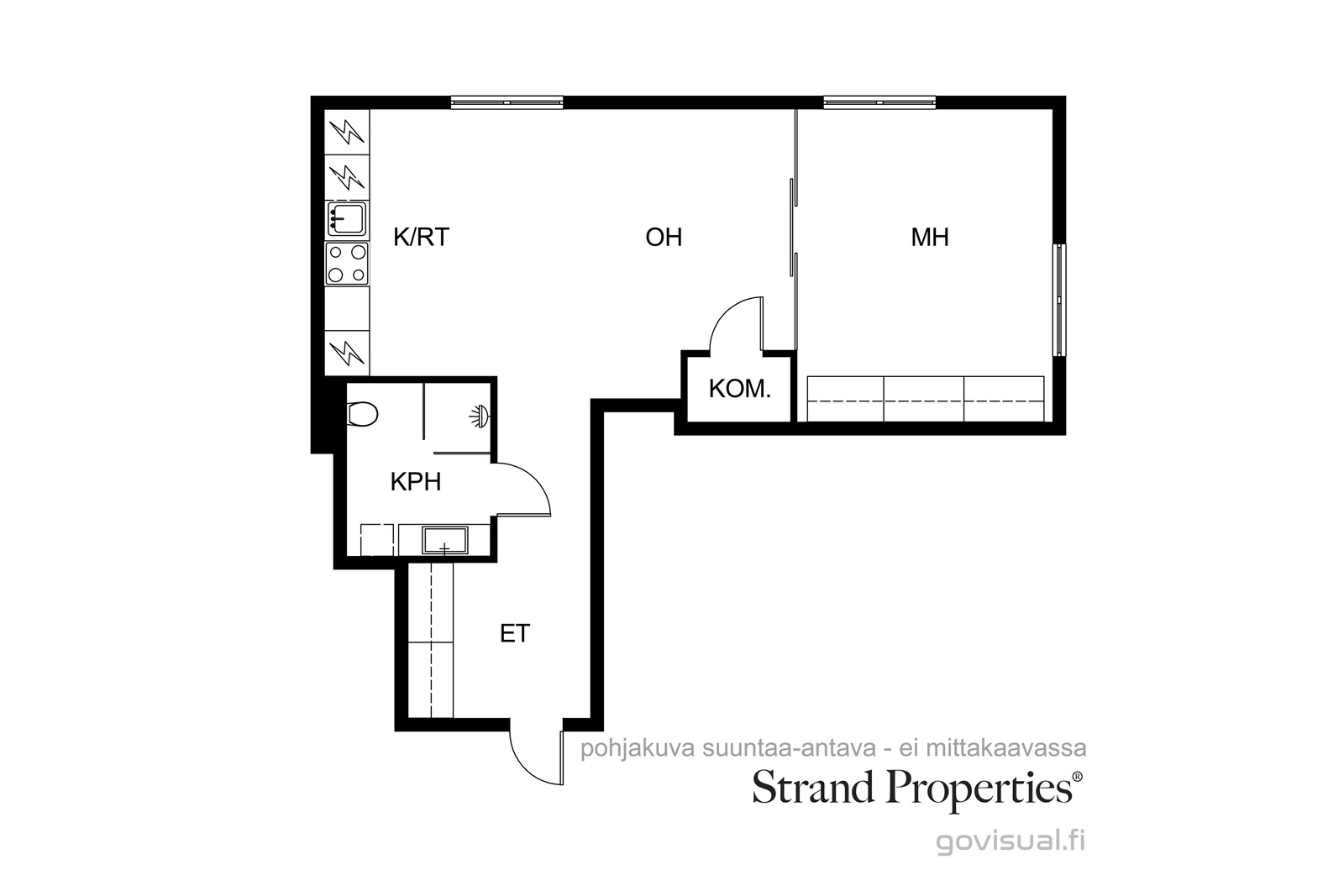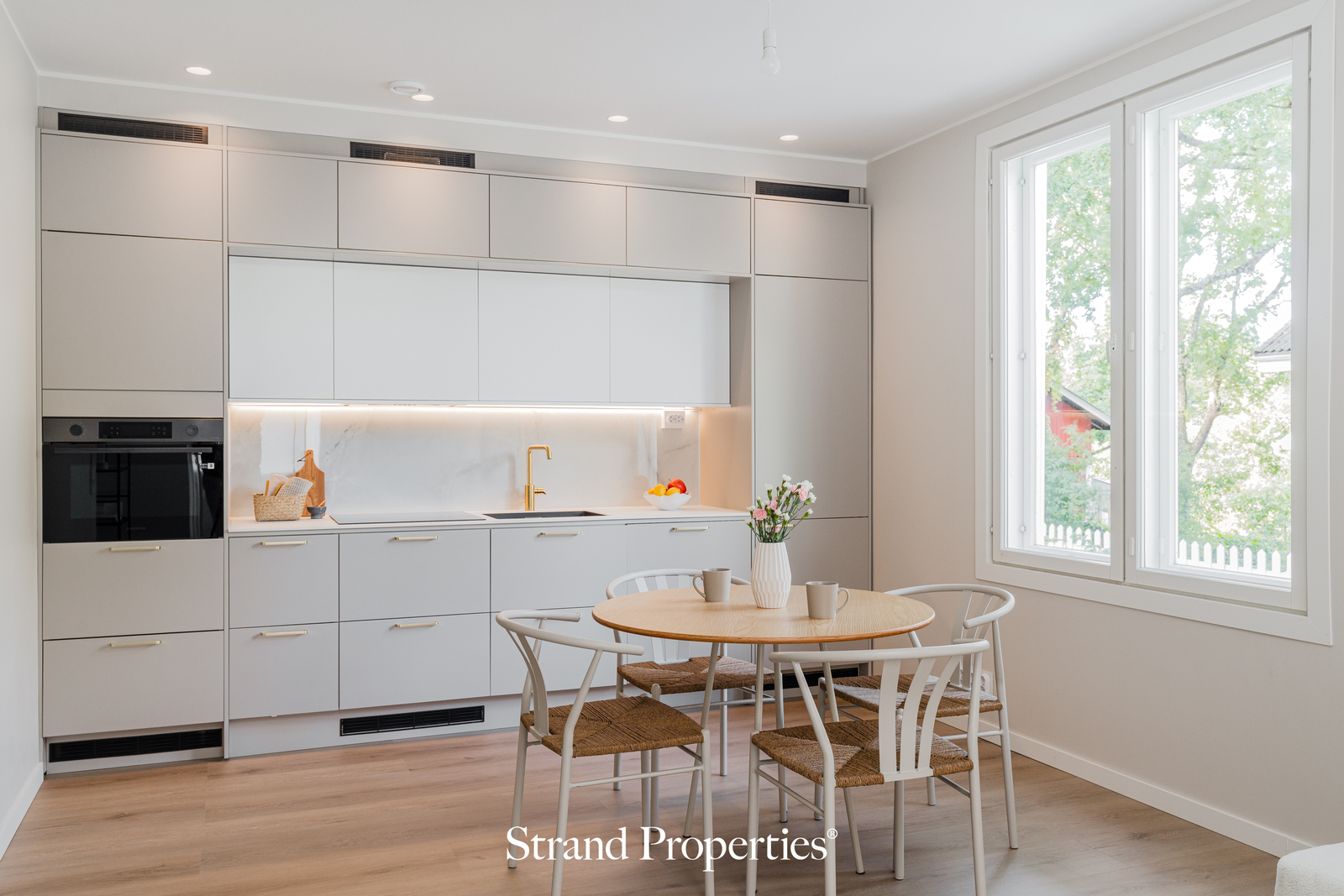 Upeat, harmoniset sävyt ovat tämän kodin se piste i:n päällä. Toisiinsa soljuvat tilat ovat käytännölliset ja kauniit. Tyylikäs avokeittiö pitää sisällään laadukkaat integroidut kodinkoneet ja lattiapinta-alaa on riittämiin ruokailukalustolle ja sohvanurkkaukselle. Arvokkaan näköiset ja valoa kauniisti läpipäästävät lasiliukuovet kultaisin yksityiskohdin erottavat makuhuoneen muusta kodista. Makuuhuoneessa on saman tyylin kiinteät kaapistot kuten myös eteisessä.
