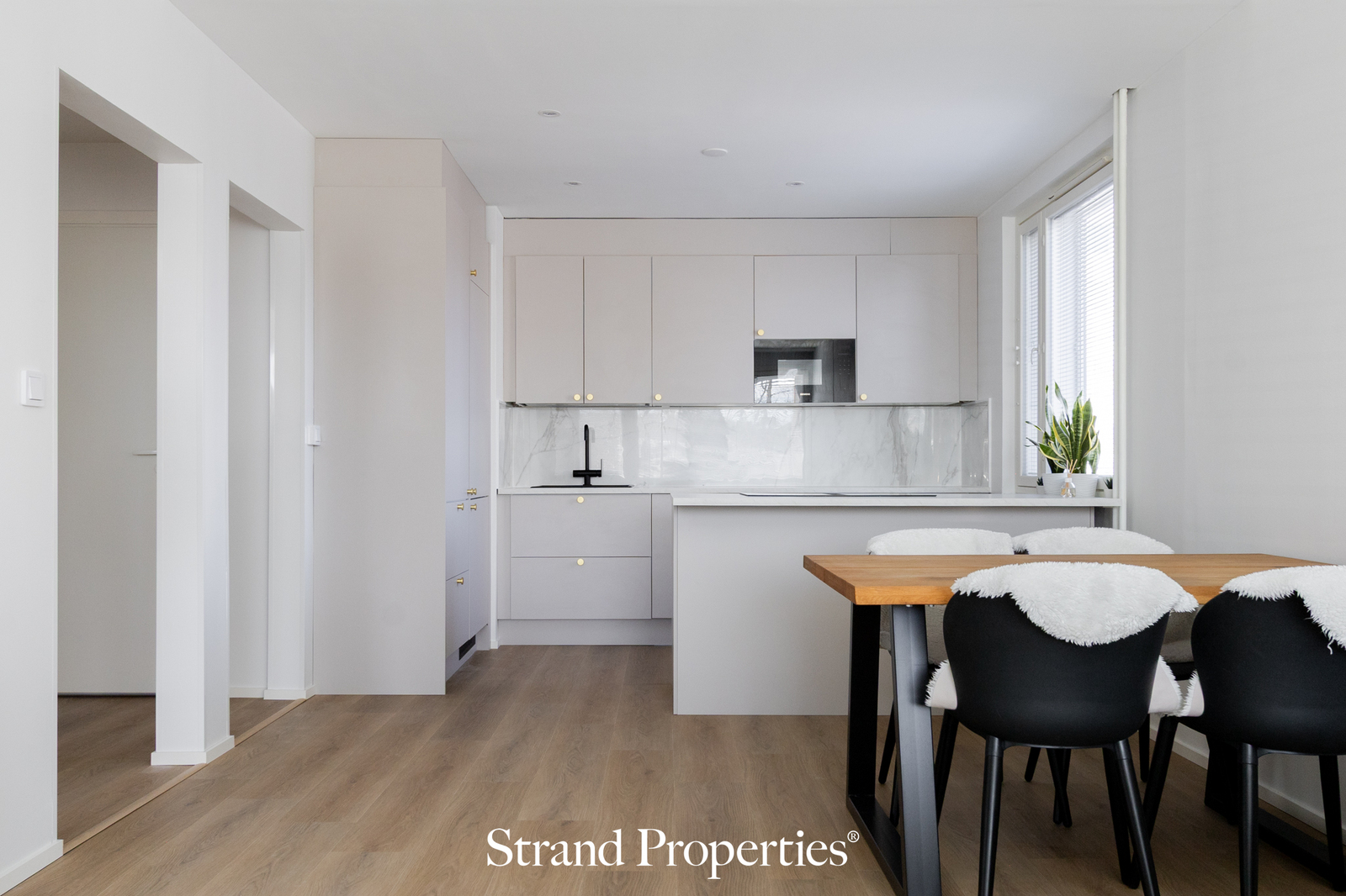 Tämä upeasti kauttaaltaan remontoitu huoneisto tarjoaa huoletonta ja tyylikästä asumista vuosiksi eteenpäin. Laadukas, ammattilaisen toteuttama saneeraus on valmistunut hiljattain, ja kokonaisuus on viimeistelty ajattomin, nykyaikaisin materiaalein. Keittiö, pesutilat sekä kaikki pinnat on uusittu huolella, luoden raikkaan ja harmonisen ilmeen, joka kestää aikaa.