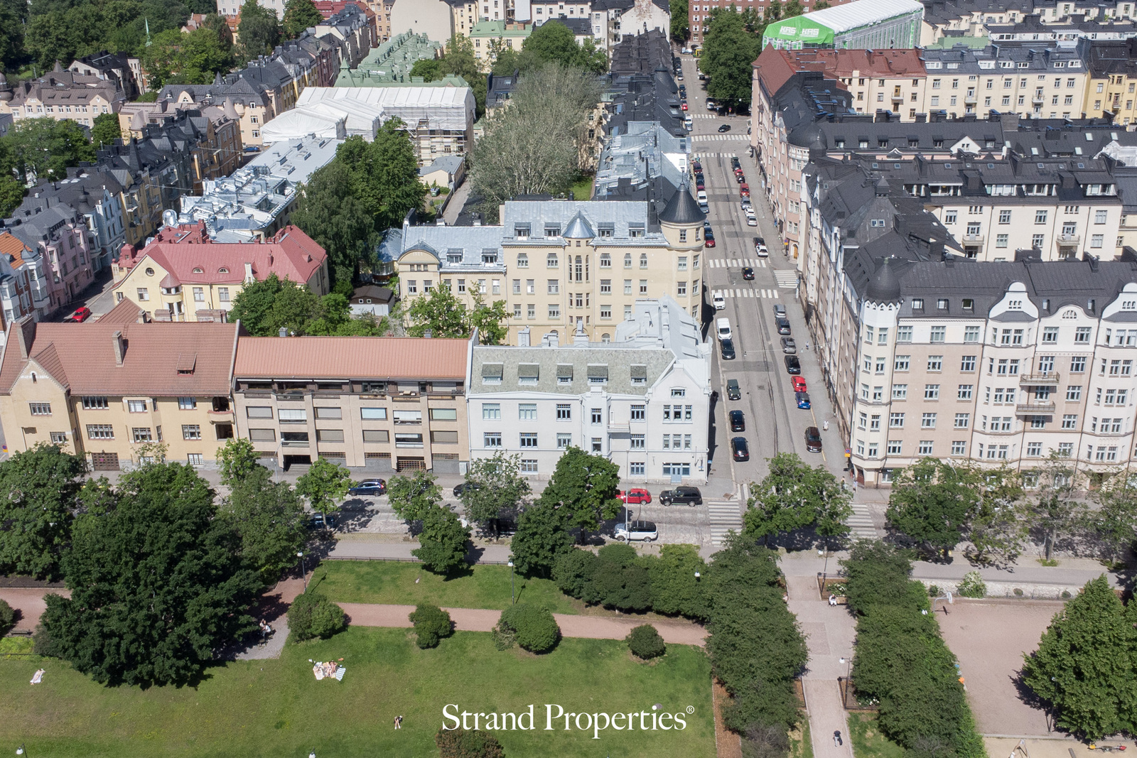 Det mysiga och rymliga vardagsrummet har en öppen spis och tillgång via dubbeldörrar till terass. Lägenheten har två sovrum med havsutsikt, ett ljust badrum och en separat toalett med fönster. I det hemtrevliga husbolaget finns hiss och en trevlig innergård.