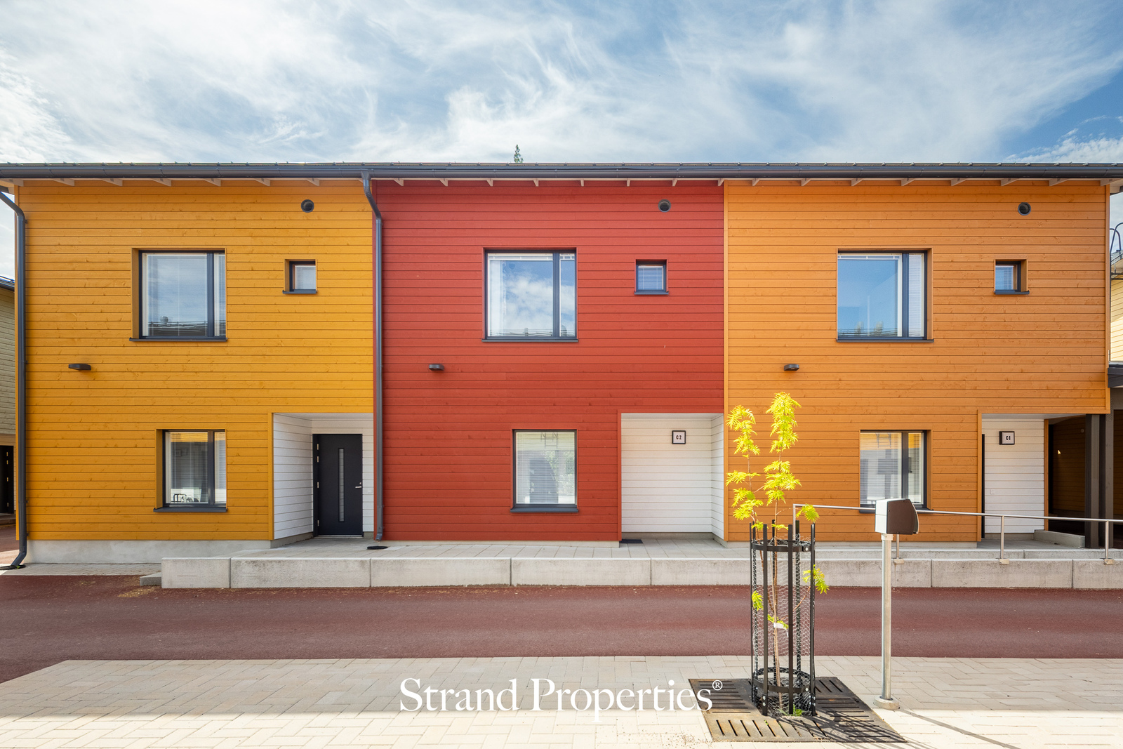 Uudenkarhea kaksikerroksinen rivitalokolmio modernissa puutalokorttelissa, jossa paljon perinteisen kyläraitin tunnelmaa. Laadukasta uutta puutaloarkkitehtuuria suurine ikkunoineen rauhallisella paikalla.