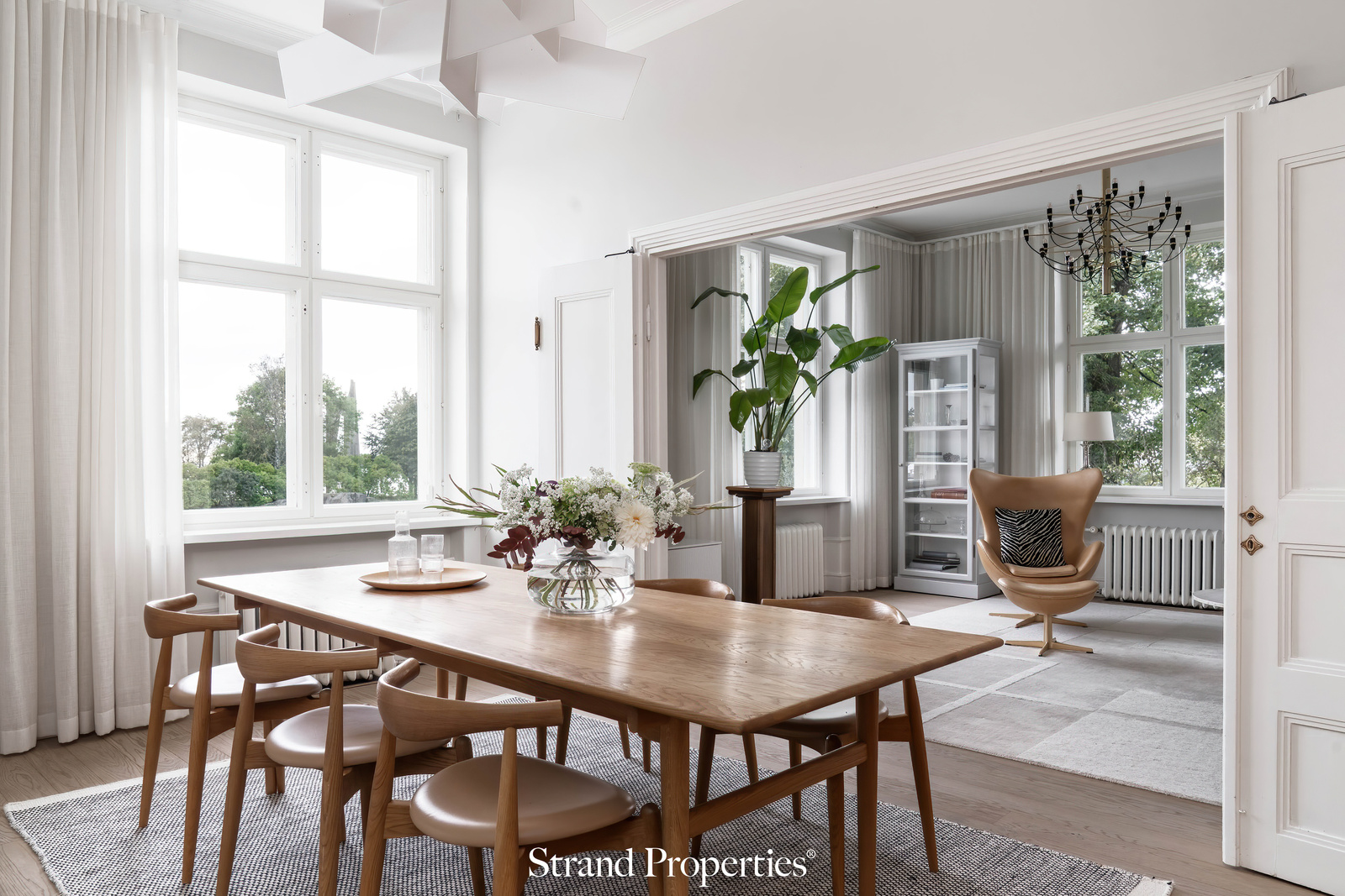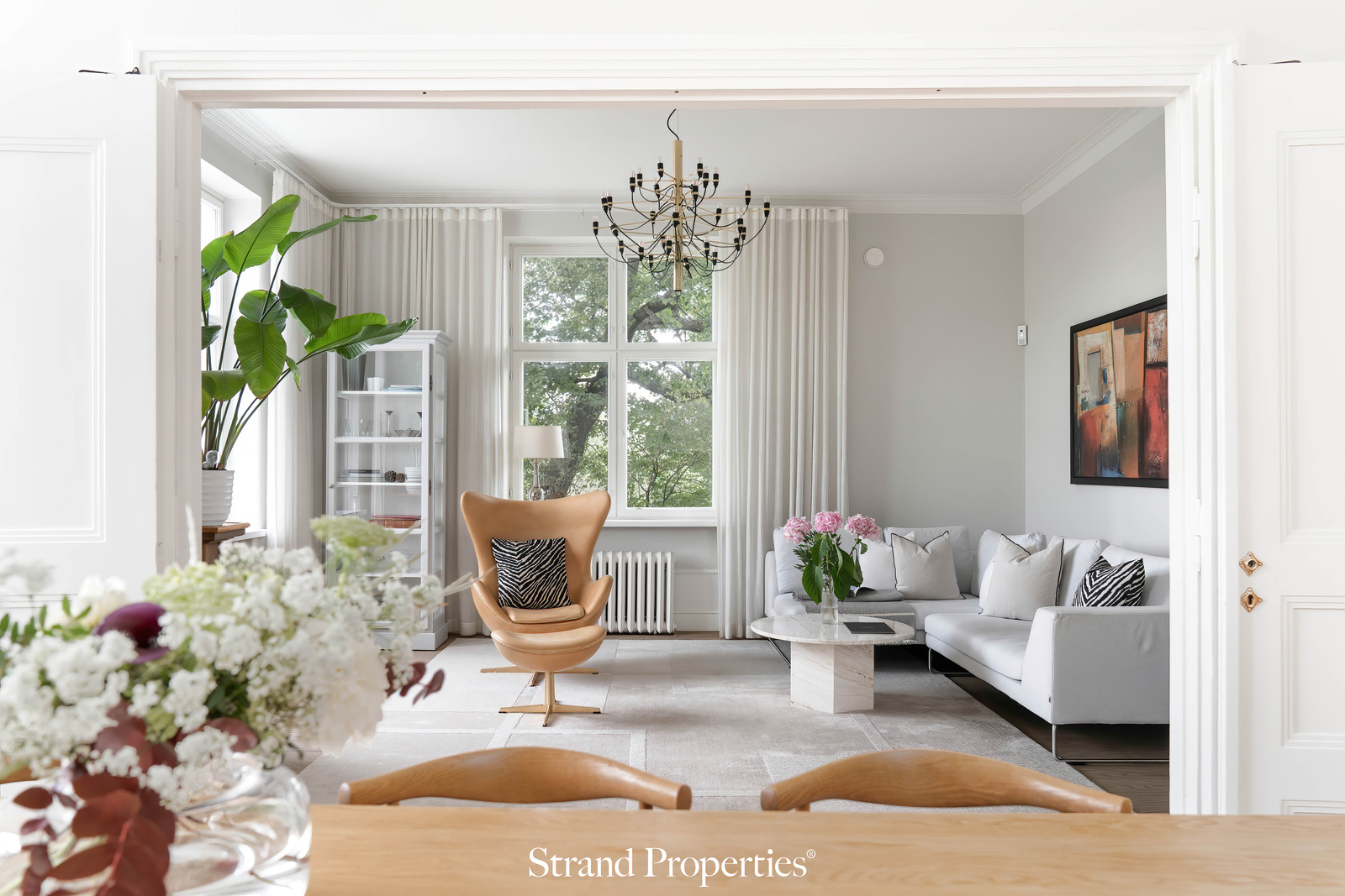 Comprehensively renovated between 2019 and 2021, this home features three bedrooms, one of which includes a beautiful and functional tiled fireplace. The kitchen and living room open toward the sea. The corner living room faces both south and west, offering tranquil views over the open sea as well as the charming park that descends from Engel Square. The renovation has provided the apartment with ample additional storage space.