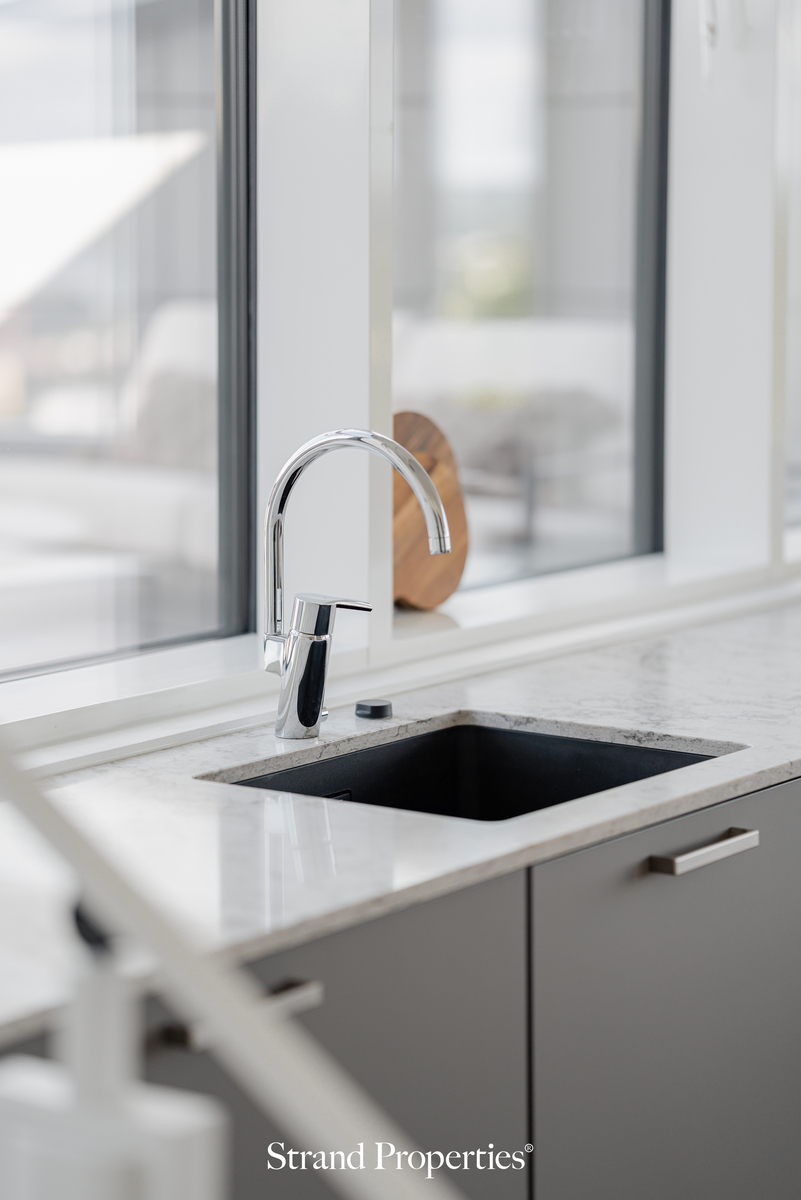 Keittiö on tiloiltaan ja materiaaleiltaan suunniteltu palvelemaan city-asunnon tyyliin. Kaikki tarvittavat materiaalit ja hyvät laskutilat ovat