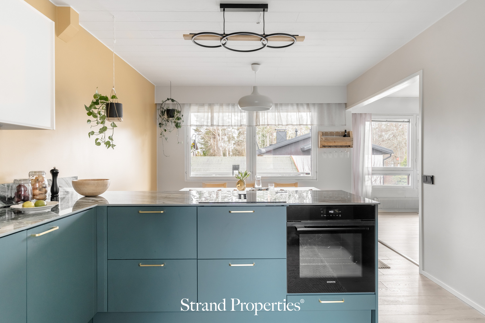 Yhteiset tilat muodostavat avaran kokonaisuuden, persoonallisen keittiön toimiessa katseenvangitsijana. Vuonna 2025 remontoitu keittiö on suunniteltu arjen toimivuus edellä – ylellisen kauniit kvartsi-työtasot, runsaat säilytystilat ja työskentelytila, mikä riittää useammallekin apukokille. Ruokailutilassa nautitaan yhteisistä aterioista ja sen myötä olohuone sulautuu osaksi viihtyisää kokonaisuutta.