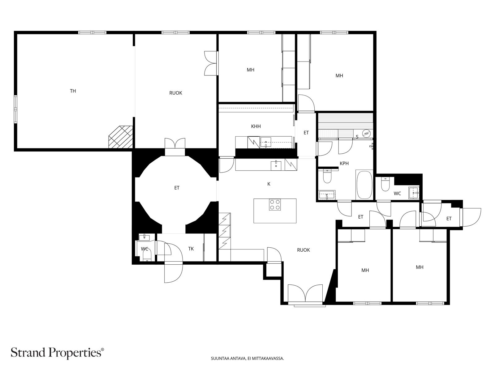 Mykistävän kaunis keittiö vie ruoanlaiton aivan seuraavalle tasolle, sillä tyylikäs, pelkistetty mattamusta HTH-keittiö on suunniteltu sekä esteetikon että intohimoisen kotikokin tarpeisiin. Säilytys- ja laskutilaa on reilusti, ja arkea helpottaa käytännöllinen, tilava saareke sekä trendikäs aamiaiskaappi, joka kätkee toiminnot siististi näkymättömiin. Vaikuttava olohuone ja ruokailutila yhdistyvät saumattomasti yhteiseksi tilaksi elämälle ja yhdessäololle, kun taas makuuhuoneet on sijoitettu omaan rauhalliseen tilaansa eli sinne, missä levätään ja lataudutaan. Putkimallinen kodinhoitohuone ja vaatehuone on integroitu älykkäästi toimivaksi kokonaisuudeksi, josta on kulku sekä keittiöön että kylpytiloihin – arjen sujuvuutta ajatellen, kauneudesta tinkimättä. Kodin tunnelmallinen spa-osasto on kuin oma luksusmaailmansa: tummissa sävyissä kylpevä tila kutsuu rentoutumaan niin saunassa kuin kylvyssä. Huolella suunniteltu valaistus viimeistelee tilojen arkkitehtuurin ja tunnelman, luoden rauhoittavan ja ylellisen kokonaisuuden, jossa jokainen hetki tuntuu hemmottelulta.