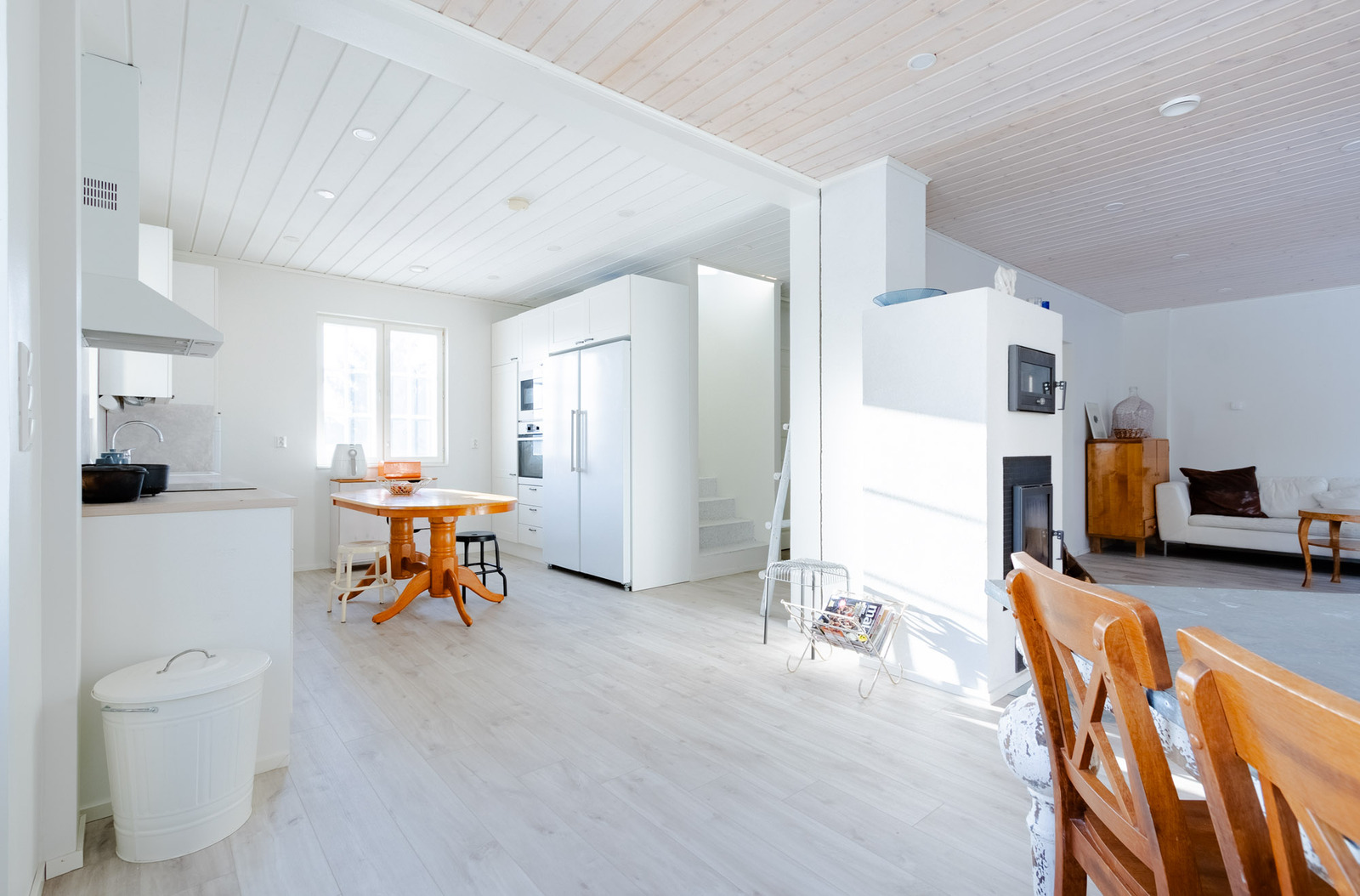 Kodin sydän on avara olohuone ja tyylikäs keittiö, jotka luovat yhdessä kodikkaan ja kutsuvan ilmapiirin. Keittiö on varusteltu moderneilla laitteilla ja tarjoaa erinomaiset puitteet ruoanlaittoon. Olohuoneessa voit nauttia takan lämpöisistä hetkistä tai rentoutua tilassa, jossa luonnonvalo pääsee virtaamaan suurista ikkunoista.