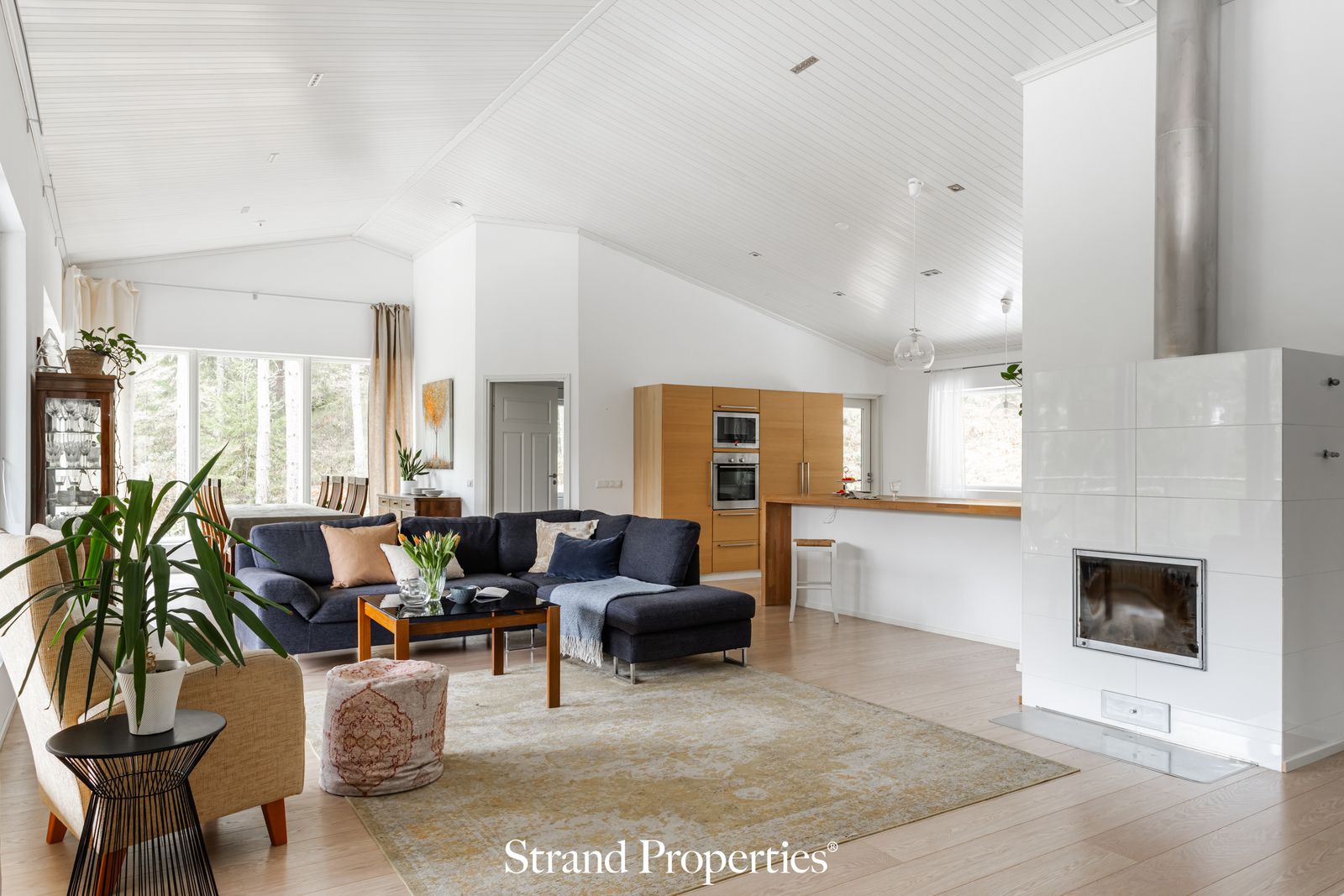 Pääsisäänkäynnistä sisään astuessa, katse kiinnittyy heti hulppeaan, miltei neljä metriä korkeaan ja yli 70 neliön kokoiseen olohuoneen, ruokailutilan- ja keittiön kokonaisuuteen, valtavine kolmeen suuntaan olevine ikkunoineen, sekä suureen lähes 30 neliön katettuun parvekkeeseen. Kvik- keittiö integroiduin kodinkonein ja puu- ja kivitasoineen, kutsuu koko perheen ja ystävät yhteisiin ruuanlaittohetkiin. Taso- ja kaappitilaa täällä on reilusti, joten tässä kodissa voi huoletta viettää juhlia, eikä tila lopu kesken tarjottavia esille nostettaessa. Tunnelmaa tilaa tuo kaunislinjainen takka.