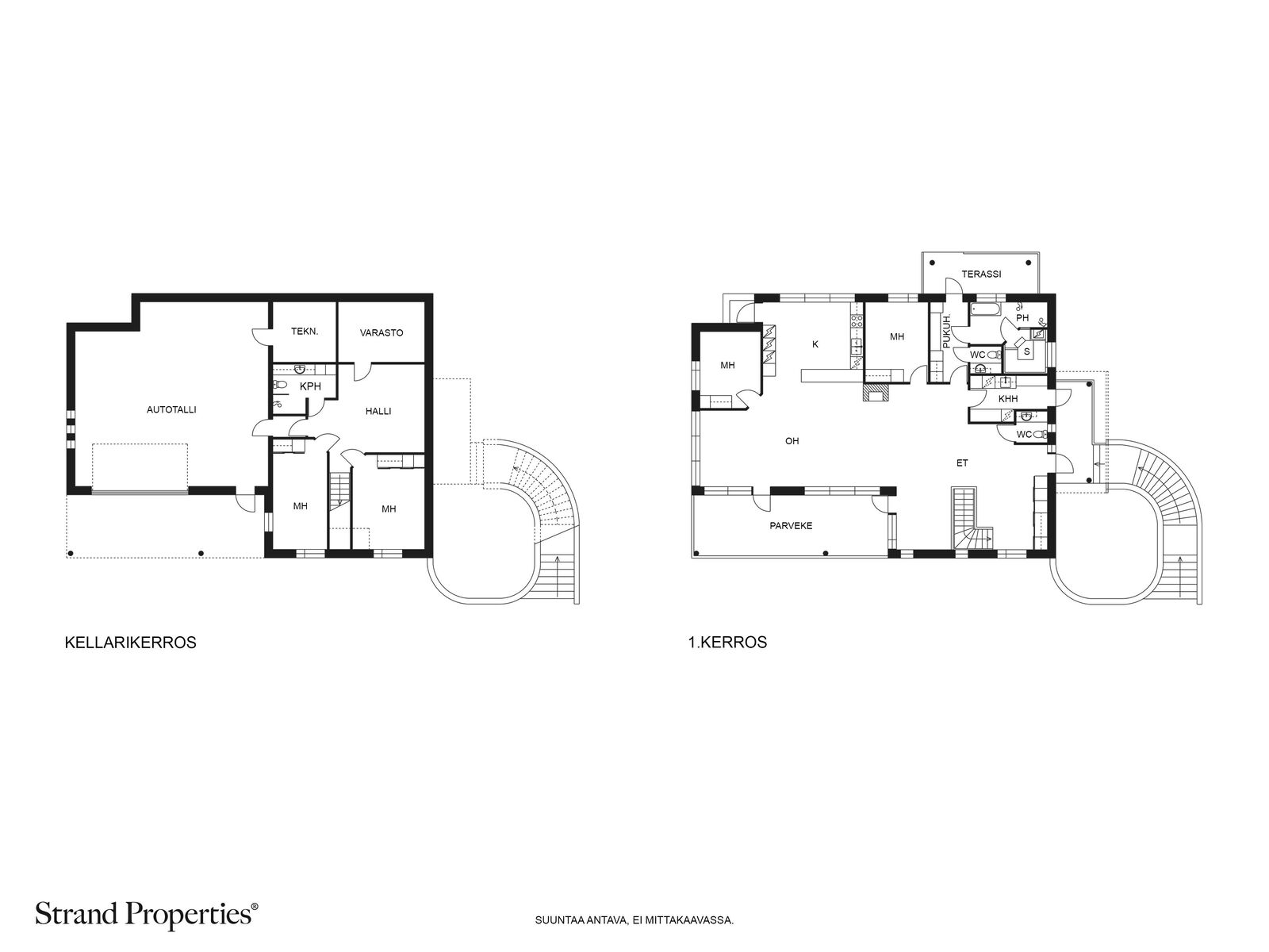 Yläkerrassa on lisäksi kaksi makuuhuonetta kaapistoineen, kaksi erillistä wc:tä, kodinhoitohuone kurasiepparilla ja omalla sisäänkäynnillä. Ammeella varustettu kylpyhuone ja tietysti sauna, josta pääsee pukeutumistilan kautta suoraan yhdelle kodin terasseista vilvoittelemaan löylyjen lomasta.