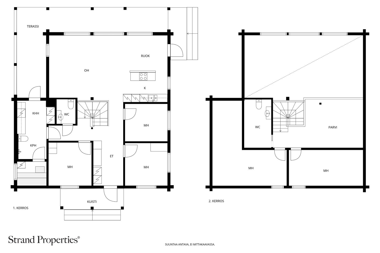 • WC-tilojen kuvaus Erilliset wc:t huvilan molemmissa kerroksissa. Lisäksi wc-istuin kylpyhuoneen yhteydessä.