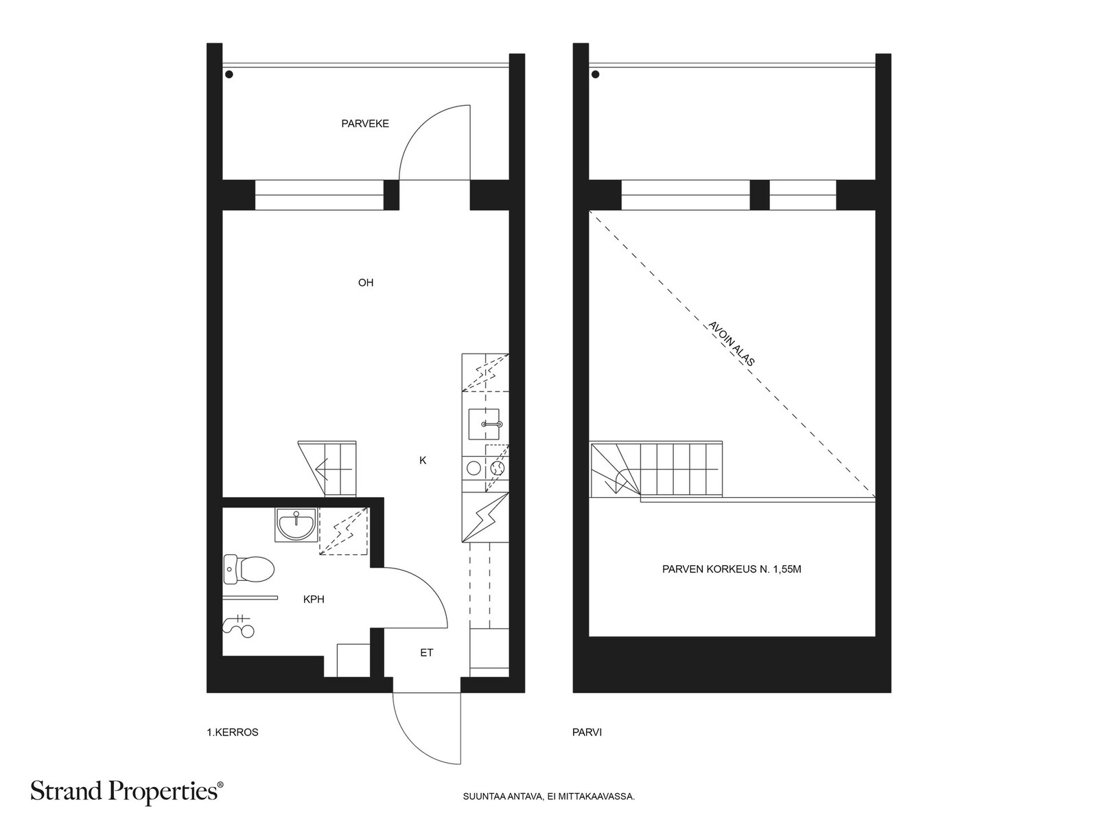 Olohuoneen ja keittiön yhtenäinen tila avautuu näyttävästi lattiasta kattoon ulottuvien suurten ikkunoiden kautta, tuoden sisään runsaasti luonnonvaloa. Parviratkaisu vapauttaa oleskelutilaan hulppean huonekorkeuden ja tekee kokonaisuudesta ilmavan sekä tilantuntua korostavan. Neliöitään suurempi pohjaratkaisu toimii erinomaisesti arjessa ja tarjoaa selkeät tilat niin oleskeluun kuin lepoon.