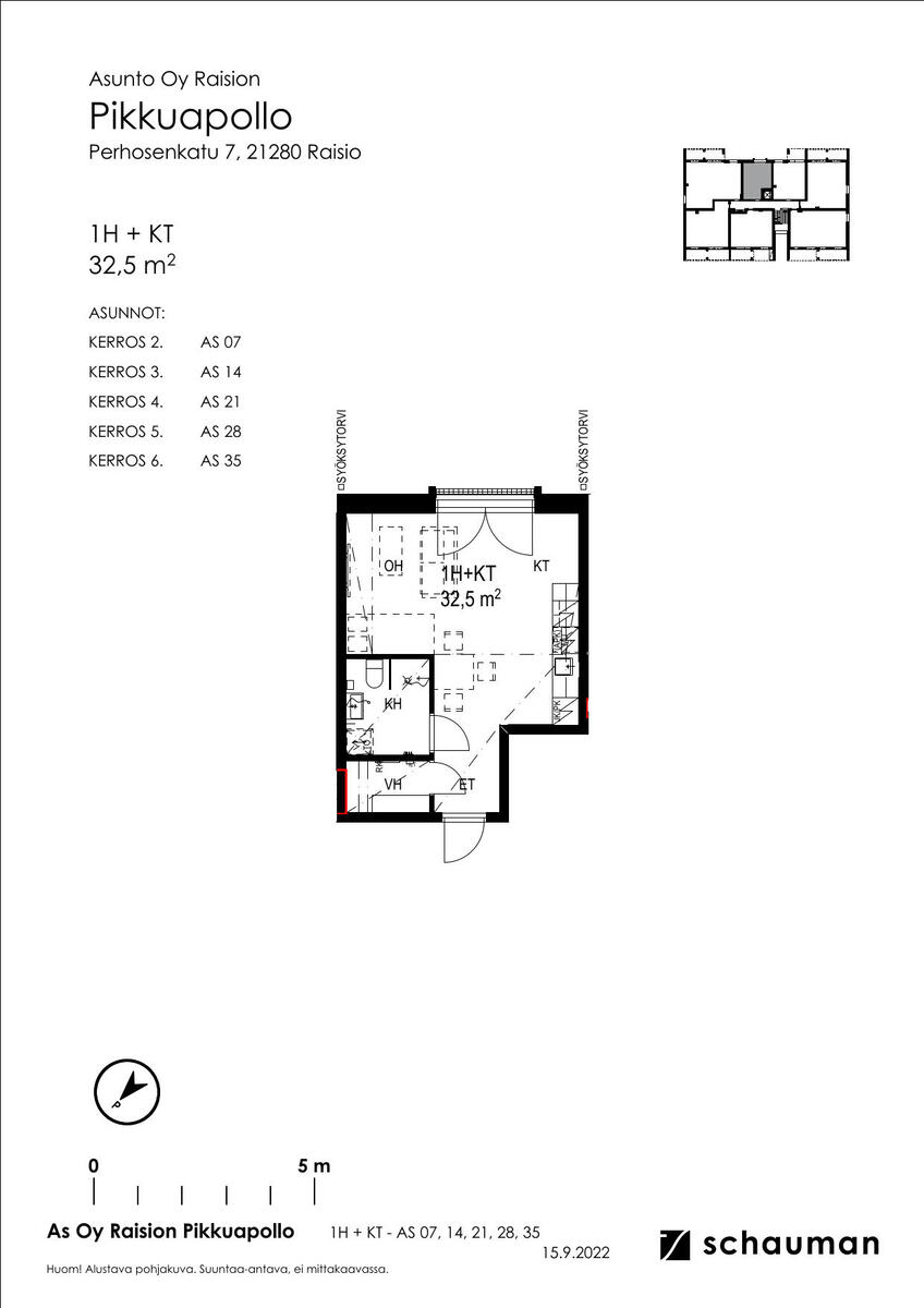 Kuusikerroksinen Asunto Oy Raision Pikkuapollo tarjoaa koteja, joissa modernit ratkaisut ja arjen toimivuus kulkevat käsi kädessä. Asunnoissa vesikiertoinen lattialämmitys ja huoneistokohtainen ilmanvaihto lisäävät asumismukavuutta, ja käytännöllisyyttä tuovat omat irtaimistovarastot sekä merkityt pyöräpaikat ulkoiluvälinevarastossa. Autokatospaikan voi halutessaan ostaa, ja siihen on mahdollista saada myös sähköauton latausvalmius. Yhtiön suojaisa ja viihtyisä sisäpiha viimeistelee kokonaisuuden.