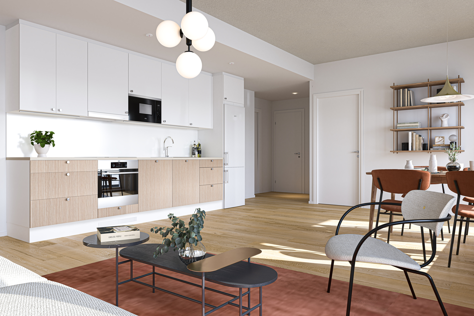 • Keittiön varustelu Keittiön kalusteet valitun sisustuskonseptin mukaisia. Kodinkoneet AEG:n mallistosta: Jääkaappi/pakastin, integroitu astianpesukone, induktioliesi, erillisuuni, mikroaaltouuni. Lattia laminaattia.