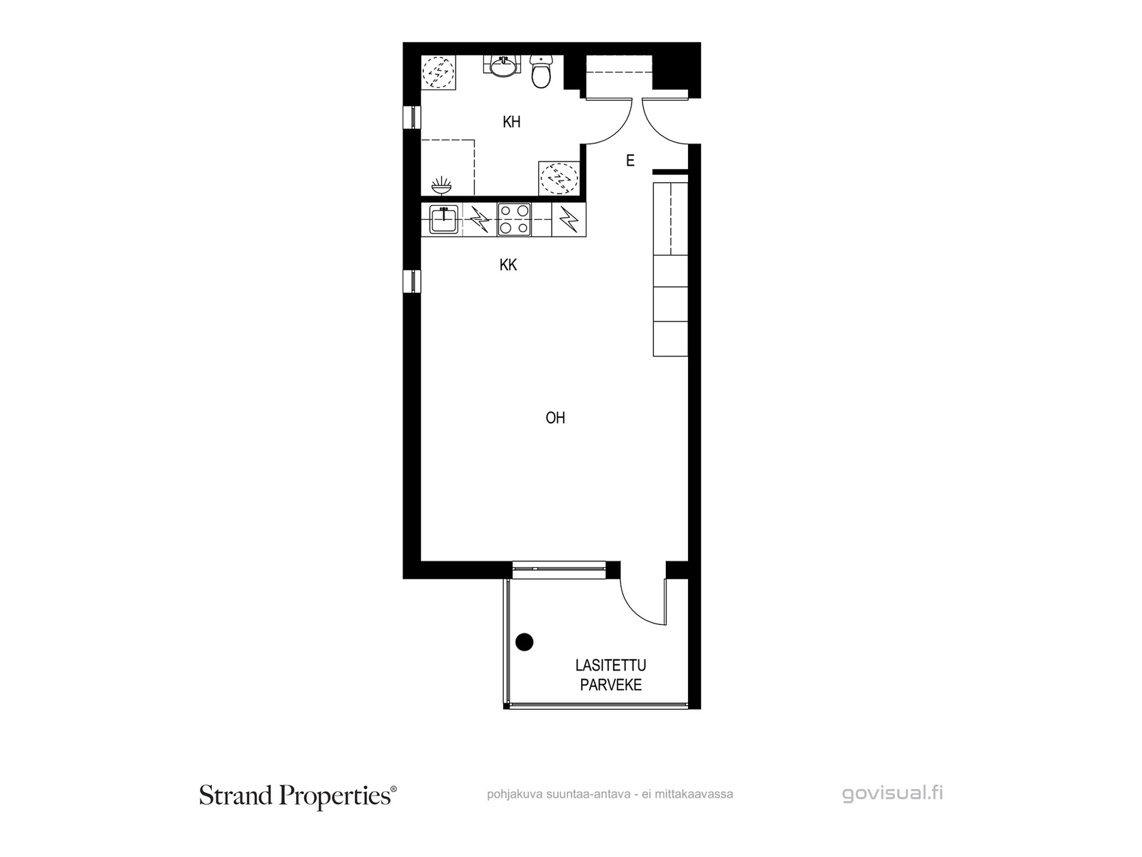 Toisen kerroksen 36,5 m²:n huoneisto tarjoaa tehokkaat neliöt ja avaran pohjaratkaisun. Oleskelutilaan mahtuvat mukavasti sohva, ruokailuryhmä ja leveä sänky, ja säilytystilaa tuo pitkä rivi kaappeja. Avonainen keittiö on käytännöllinen. Tilava kylpyhuone on laatoitettu ja siellä on paikka pesutornille.