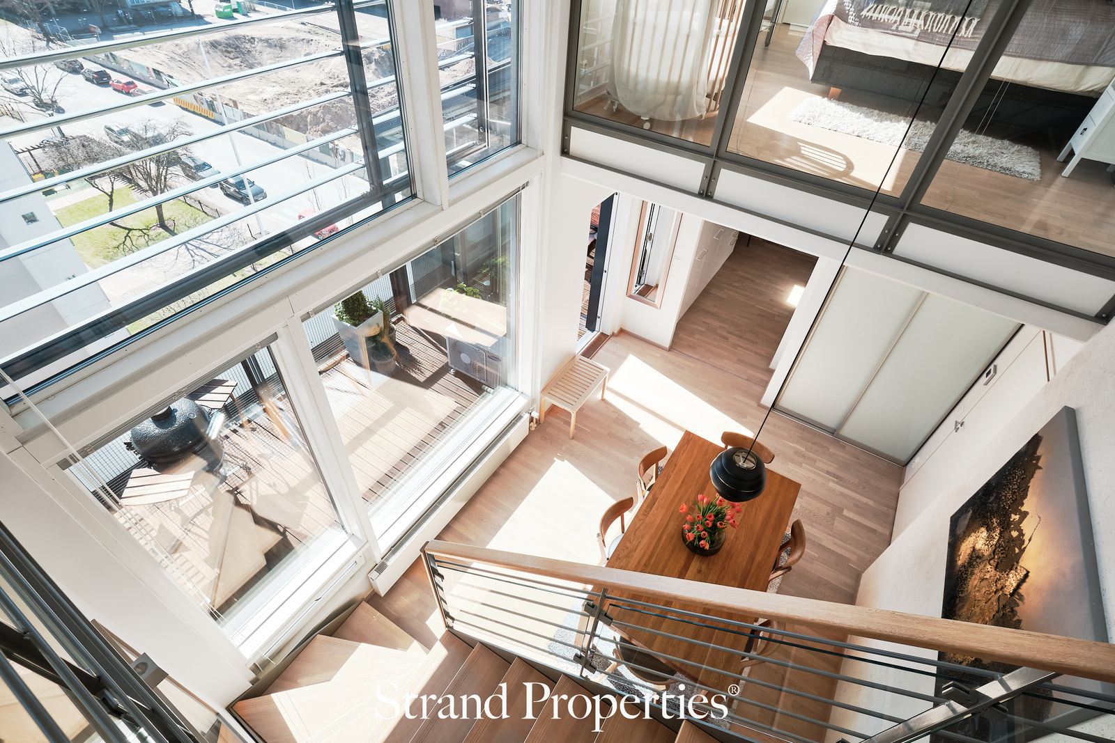 Asunnon sydän on huikea, kahden kerroksen korkuinen oleskelu-/ruokailutila, jossa lattiasta kattoon ulottuvat ikkunat tulvivat luonnonvaloa sisään vuoden ympäri. Avara tila yhdistyy saumattomasti tyylikkääseen HTH-keittiöön, jossa on integroidut AEG-kodinkoneet.
