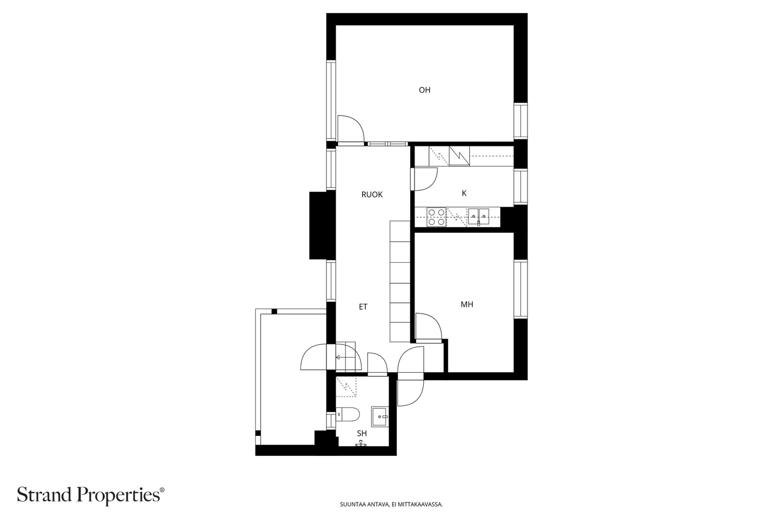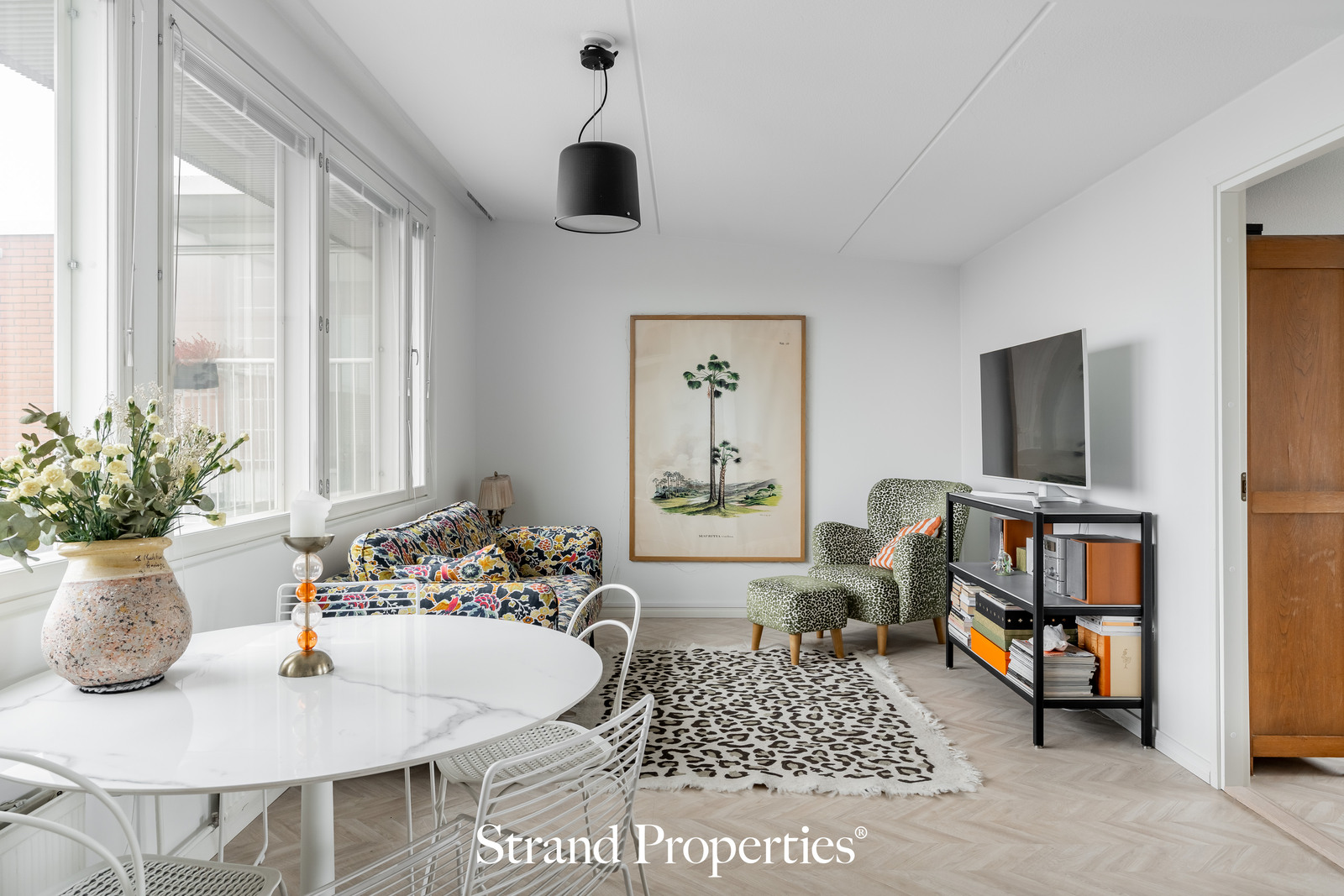 Kodin sisustuksessa yhdistyvät tyylikkyys ja rauhallisuus. Keittiössä huomio kiinnittyy upeisiin mustiin kaapistoihin, jotka luovat näyttävän kontrastin vaaleille pinnoille. Tilava olohuone ja runsas ikkunapinta tuovat asuntoon paljon luonnonvaloa ja avaruutta.