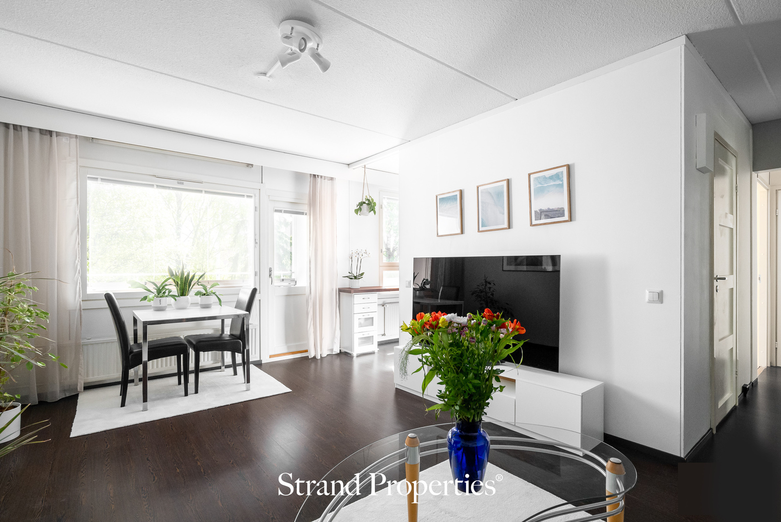 Rauhallisella sijainnilla viihtyisä ylimmän kolmannen kerroksen (ei hissiä) tilava kaksio, jonka keittiö on uusittu täysin vuonna 2020. Keittiössä astianpesukone, induktiotaso, erillisuuni, liesituuletin, jääkaappi/pakastin ja kokopuiset työtasot. Toimiva pohjaratkaisu, reilun kokoinen olohuone, tilava makuuhuone ja erillinen vaatehuone. Aurinkoinen lasitettu parveke puistonäkymin on suojaisa kesäkeidas.