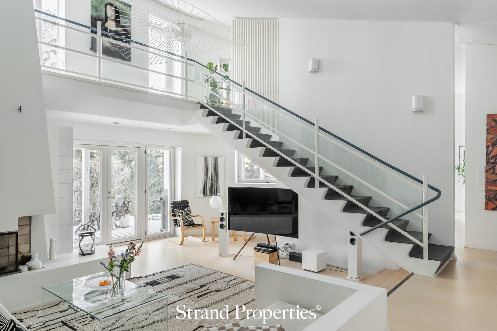 Korkea olohuone avautuu suurilla ikkunapinnoilla, jotka tulvivat luonnonvaloa ja tuovat ympäröivän maiseman osaksi sisätiloja. Tyylikkäät muodot, harkitut materiaalit ja ajaton arkkitehtuuri tekevät kokonaisuudesta aikaa kestävän.