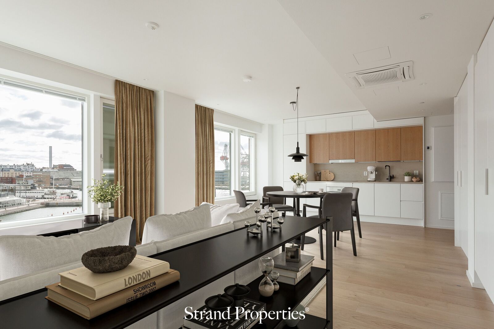 Merenrantanäkymillä varustettu valoisa, etelään suuntaava koti 3. kerroksessa. Avoimen huoneiston vaaleassa ja rauhallisessa ilmeessä on lämpöä hiekan ja tammen sävyistä, joita täydentävät harkitut tummat yksityiskohdat. Leveä tammilankkuparketti ja tammiviilutetut ovet, samoin kylpytilojen ja keittiön pehmeä, epäsuora valaistus tuovat arkeen harkittua mukavuutta.