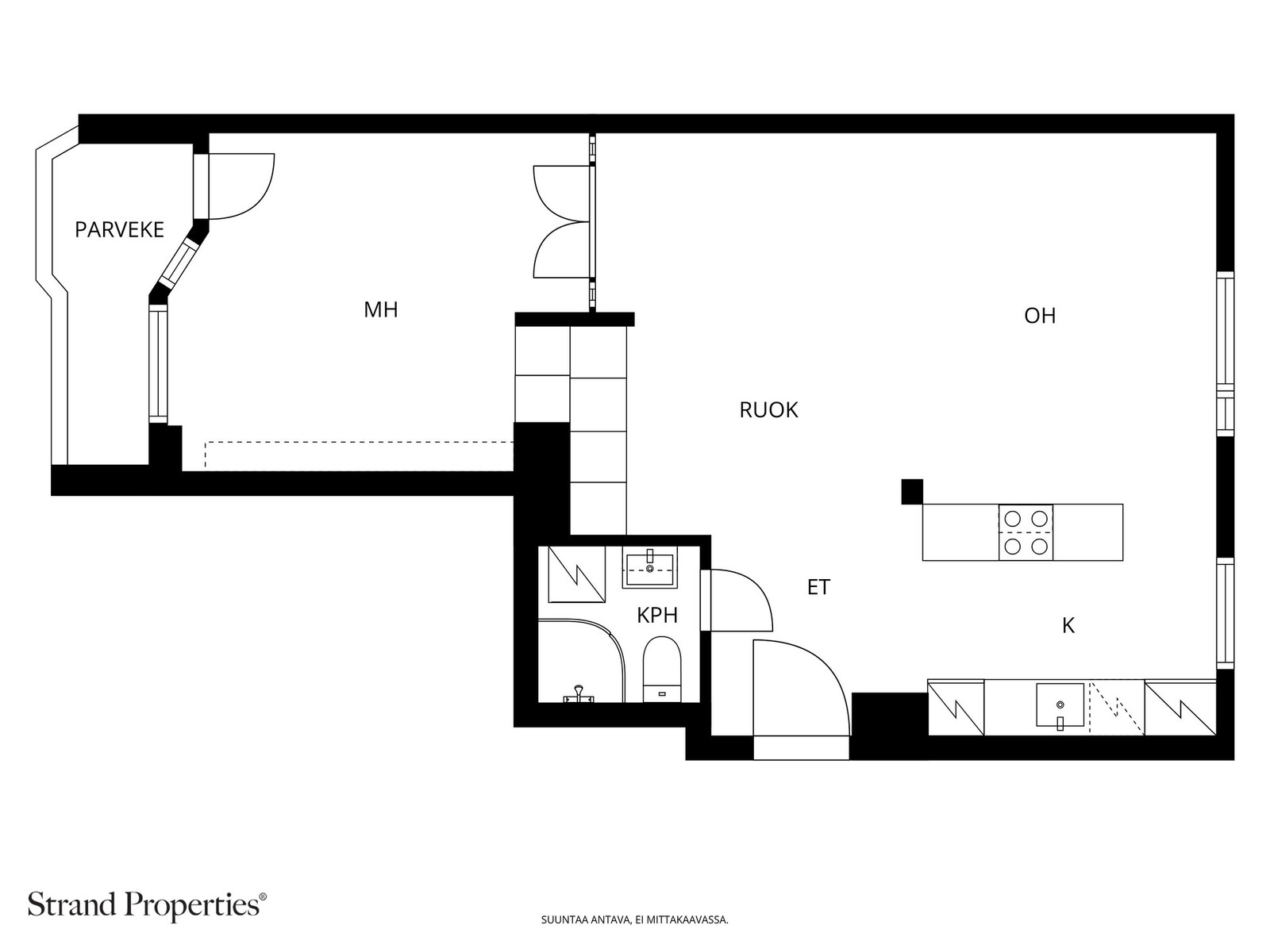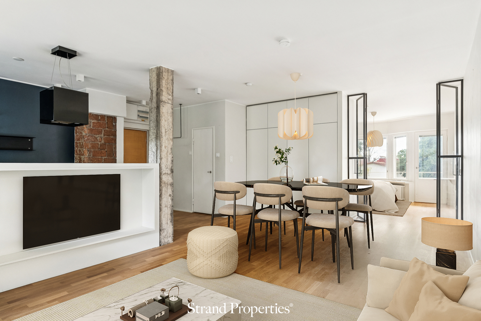 Huoneistossa on vuonna 2019 uusittu keittiö sekä toteutettu pintaremontti, joiden yhteydessä huonejärjestystä muokattiin korostamaan läpitalon valoisuutta ja avaruutta. Persoonalliset yksityiskohdat, kuten keittiön tiiliseinä, tuovat kotiin särmää ja rouheutta. Tilaa täydentävät modernit kiintokalusteet sekä eteisessä että makuuhuoneessa. Makuuhuoneesta on kulku omalle parvekkeelle, josta avautuvat näkymät puistomaisemaan korkeiden puiden suuntaan.