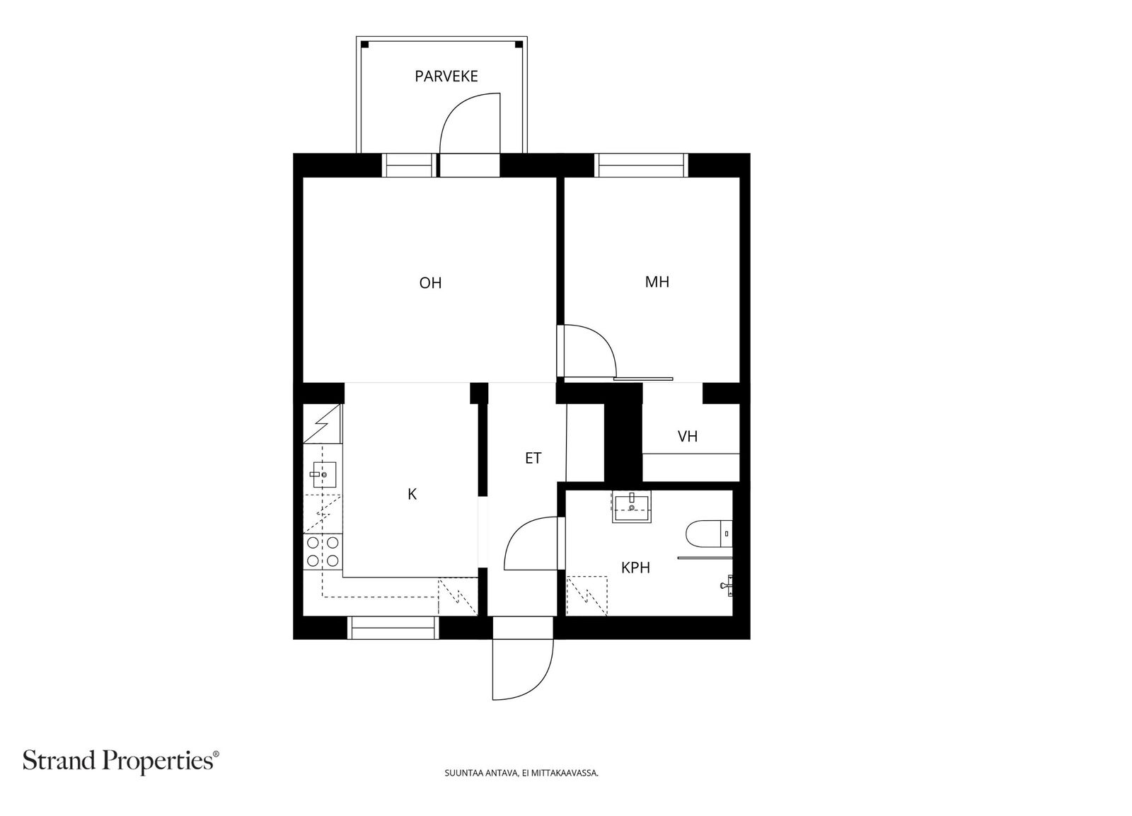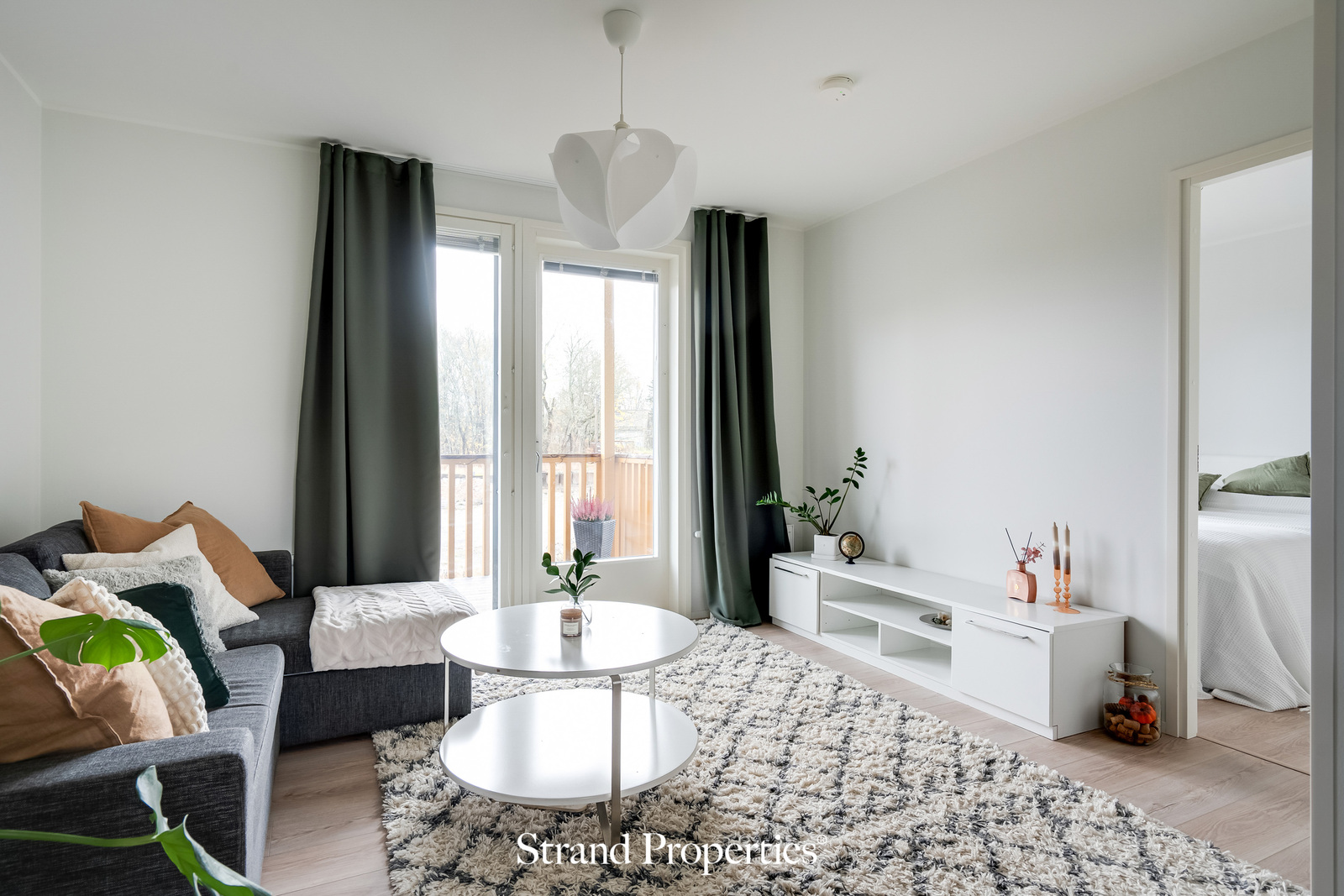 Viihtyisä olohuone muodostaa kutsuvan tilan rentoutumiselle, ja kesäisin yhteisen ajanvieton tilat laajenevat tilavalle parvekkeelle. Vaalea keittiö yhdistyy luontevasti osaksi olohuonetta. Keittiössä on runsaasti säilytys- ja työskentelytilaa, ja myös ruokapöytä löytää vaivatta paikkansa. Erillinen makuuhuone tuo mukavuutta arkeen, ja sen yhteydessä sijaitseva vaatehuone tarjoaa aina kaivattua säilytystilaa. Tilava kylpyhuone on käytännöllinen ja suunniteltu niin, että myös pyykkihuolto sujuu vaivattomasti.