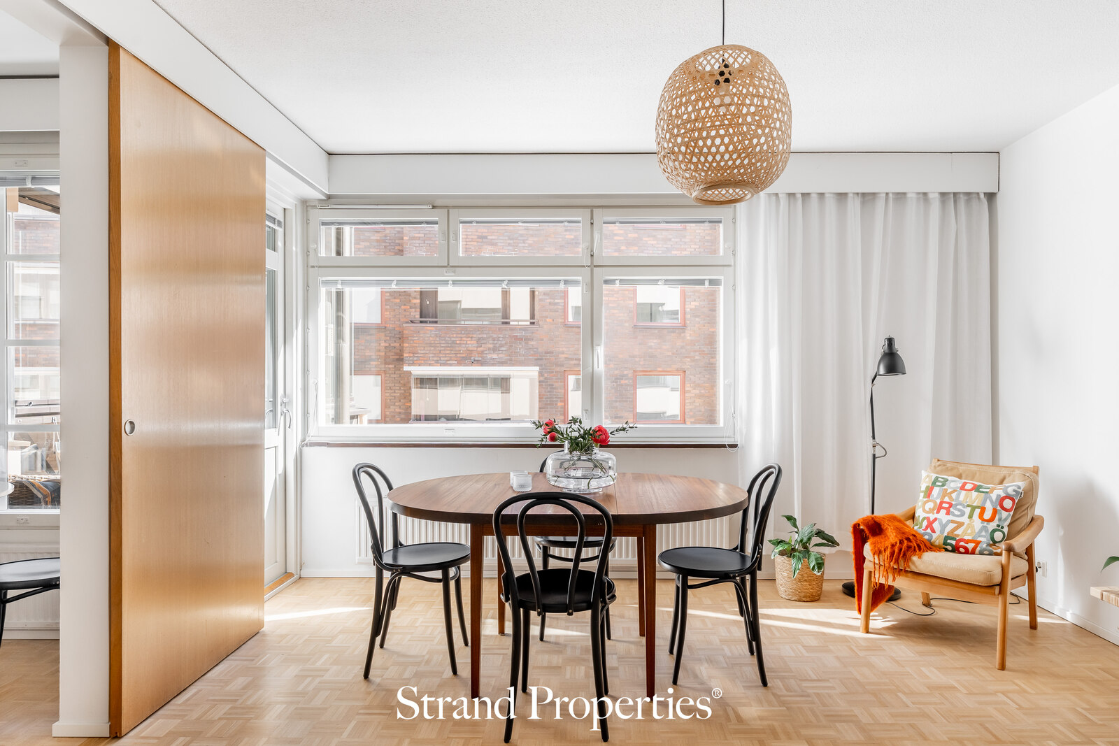 Tämä loistavalla pohjaratkaisulla varusteltu asunto sijaitsee rauhallisella paikalla Helsingin arvostetussa Ullanlinnassa, aivan kaupungin ja meren tuntumassa. Kodin ehdottomaksi katseenvangitsijaksi nousee lasitettu parveke, jolta avautuu viehättävä näkymä merelle – täydellinen paikka nauttia aamukahvista tai rauhoittua päivän päätteeksi.