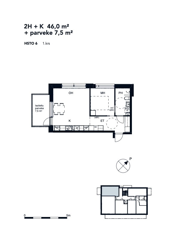 Tarjolla on yksi 46m2 kokoinen asunto ensimmäisessä asuinkerroksessa (pohjakerrosta ylempänä).