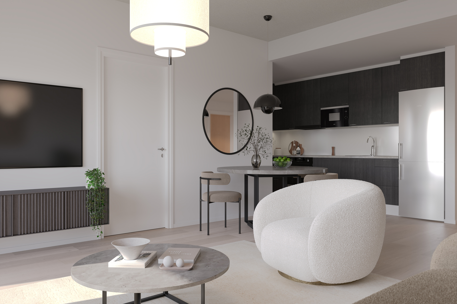 • Keittiön varustelu Keittiön kalusteet valitun sisustuskonseptin mukaisia. Kodinkoneet AEG:n mallistosta: Jääkaappi/pakastin, integroitu astianpesukone, induktioliesi, erillisuuni, mikroaaltouuni. Lattia laminaattia.