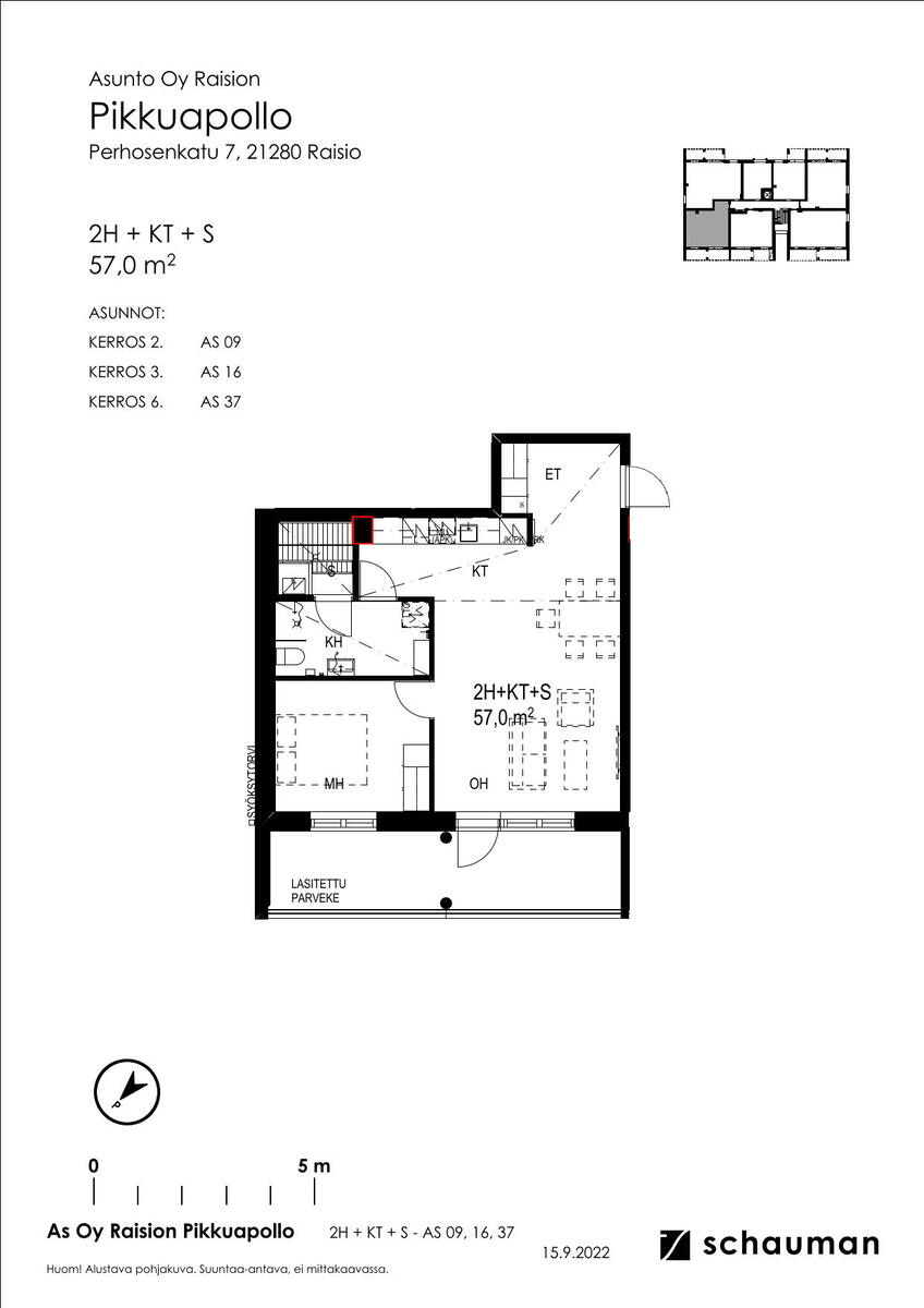 Kuusikerroksinen Asunto Oy Raision Pikkuapollo tarjoaa koteja, joissa modernit ratkaisut ja arjen toimivuus kulkevat käsi kädessä. Asunnoissa vesikiertoinen lattialämmitys ja huoneistokohtainen ilmanvaihto lisäävät asumismukavuutta, ja käytännöllisyyttä tuovat omat irtaimistovarastot sekä merkityt pyöräpaikat ulkoiluvälinevarastossa. Autokatospaikan voi halutessaan ostaa, ja siihen on mahdollista saada myös sähköauton latausvalmius. Yhtiön suojaisa ja viihtyisä sisäpiha viimeistelee kokonaisuuden.