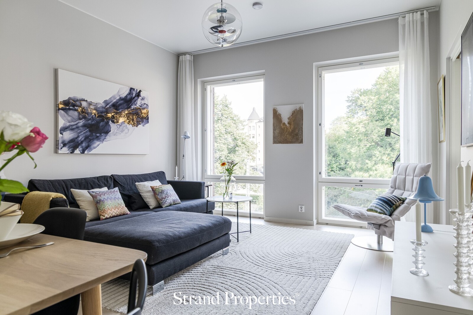 Avokeittiö asettuu käytännöllisesti yhdelle seinustalle, jolloin olohuoneeseen ja ruokailutilalle jää avaraa yhtenäistä tilaa. Suuret ikkunat ja lasitettu parveke tiiliseinien suojassa luovat kauniin kehyksen arkeen ja juhlaan. Parvekkeella on oma tunnelmansa – suojaisa paikka aamukahville tai iltaviinille kaupungin sykkeen tuntumassa.