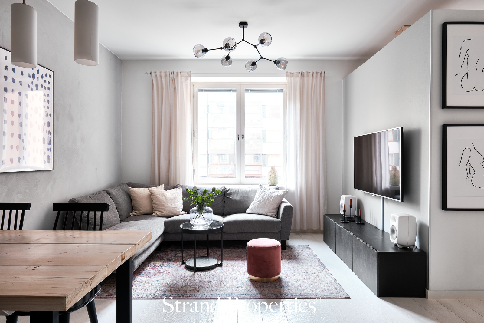 Tämä toisen kerroksen huoneisto hurmaa heti eteisestä alkaen hyvällä fiiliksellä. Avarassa olohuoneessa on tilaa oleskelulle ja ruokailulle ja tyylikäs avokeittiö saarekkeineen on sekä toimiva että näyttävä – varustettuna mm. viinikaapilla, astianpesukoneella ja laadukkailla kodinkoneilla.