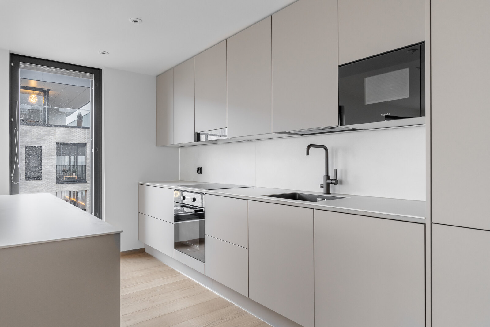 • Keittiön varustelu Keittiön työtasot ovat keraamista laattaa. Mielen laadukkaat kodinkoneet: integroitu jääkaappi, integroitu pakastin työtason alle, induktioliesi liesitasotuulettimella, erillisuuni, integroitu mikroaaltouuni ja astianpesukone. Lattia on tammiparkettia ja seinät on maalattu.