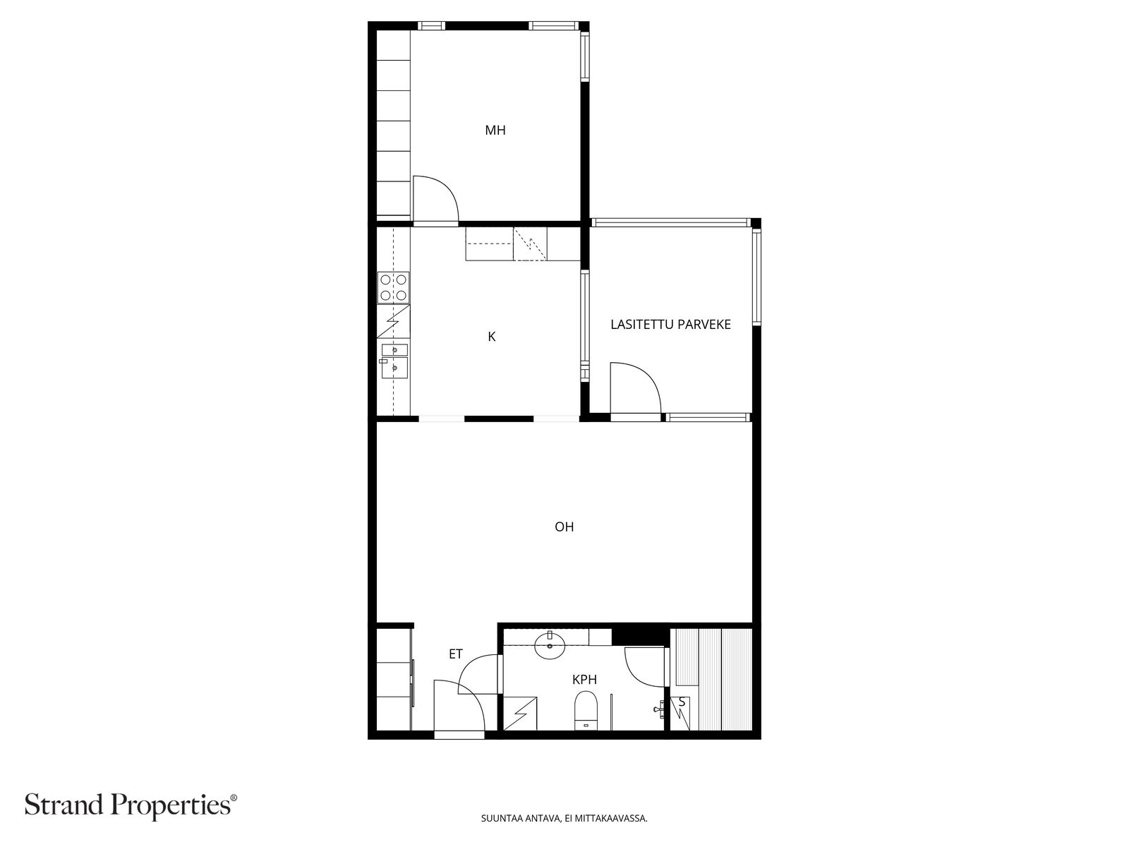 62 m² käsittää avaran olohuoneen, erillisen keittiön sekä tilavan makuuhuoneen. Suuret ikkunat kahteen suuntaan tuovat runsaasti luonnonvaloa ja avartavat tunnelmaa. Olohuoneelta on käynti omalle reilun kokoiselle parvekkeelle, josta avautuu kaunis näkymä yli kaupungin kattojen.