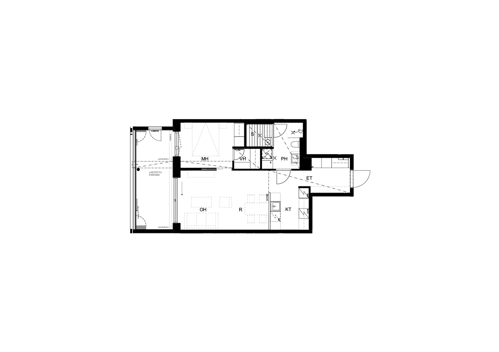 Tämä kaksio sijaitsee toisessa kerroksessa ja lasitetun terassin ledessä on myös suojainen avoterassi.