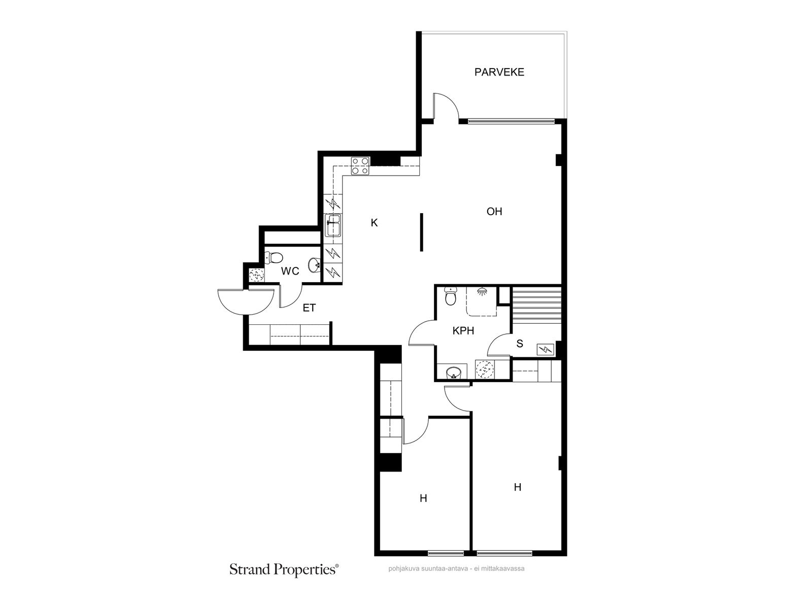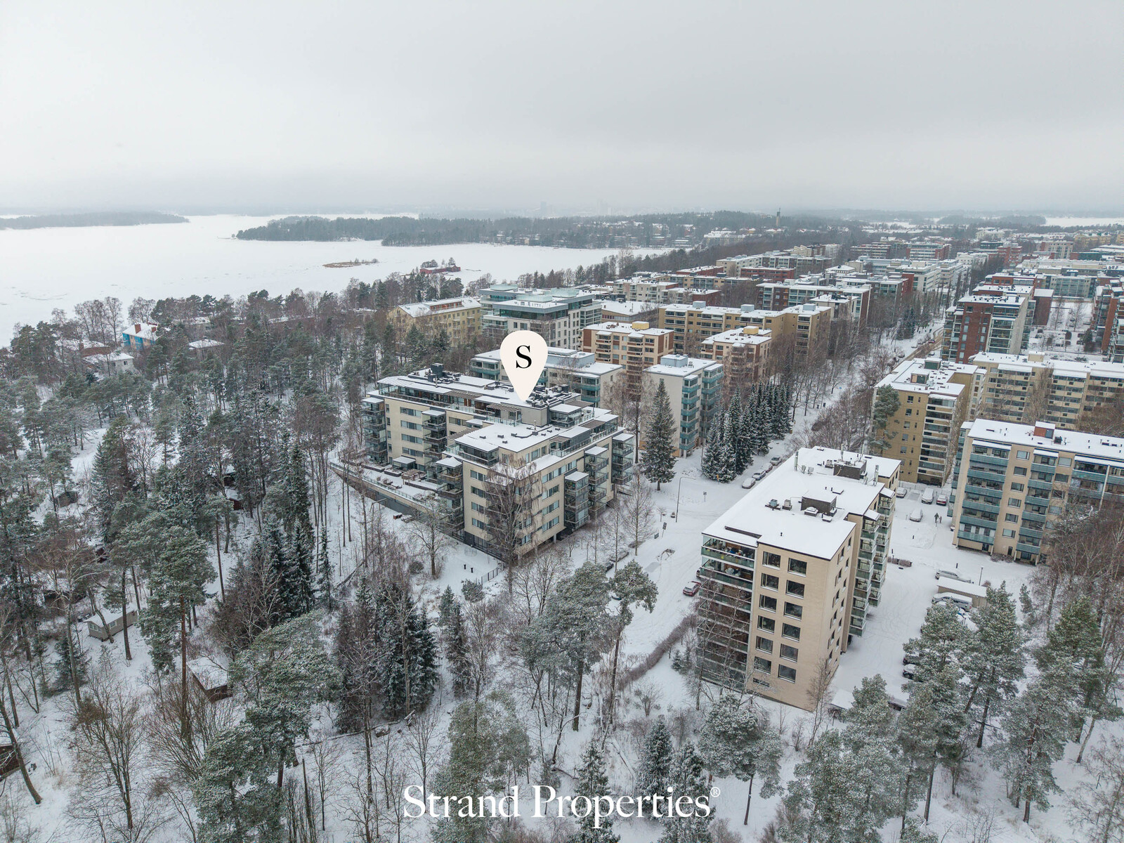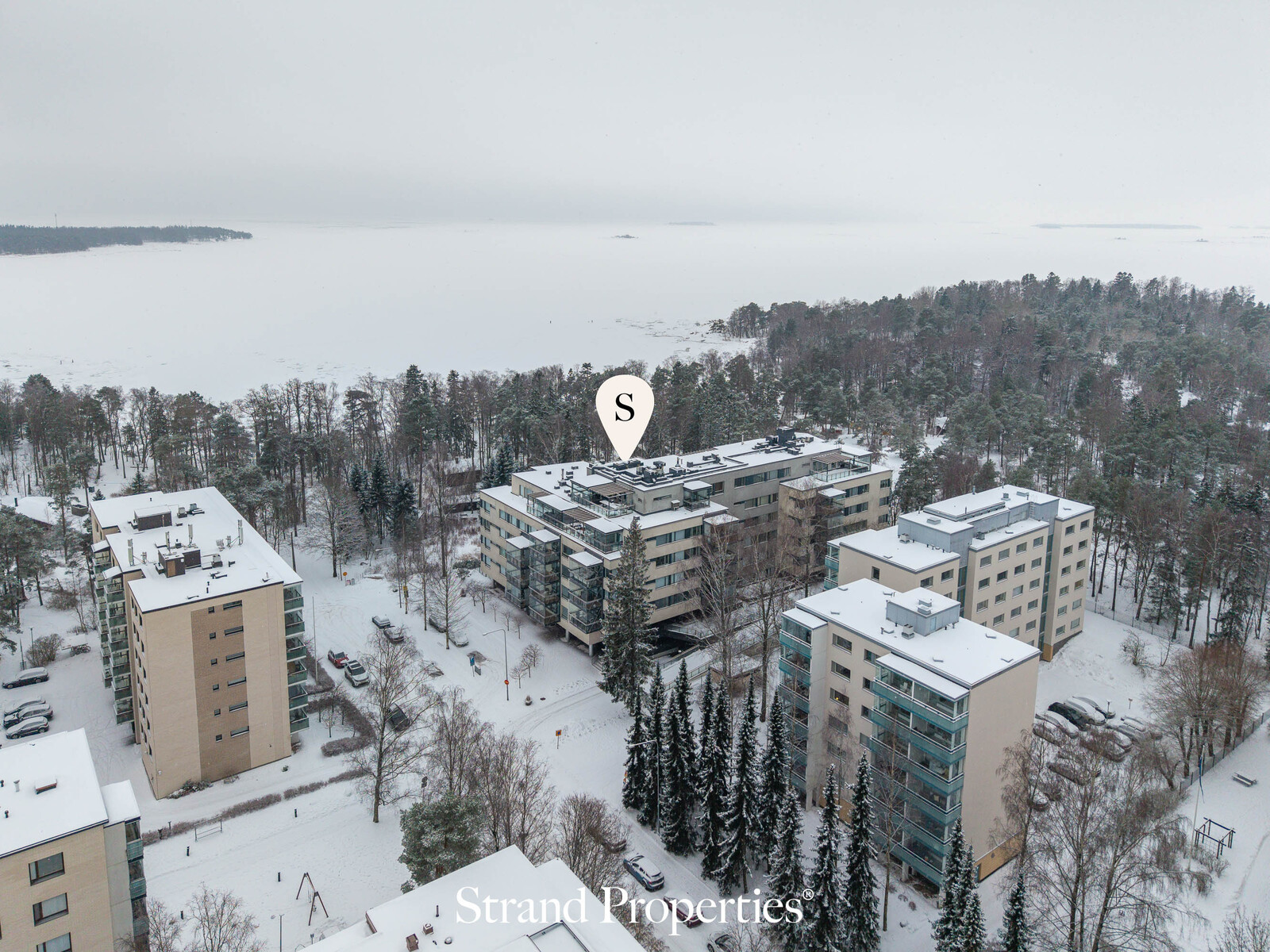 Avara kolmio meren ja rantaraitin vieressä. Avarat ja valoisat tilat. Iso lasitettu meren puoleinen terassiparveke antaa kauniin luontonäkymän ja puiden välistä merinäkymää. Vierestä kulkeva rannan kävelyreitti ja rannan uimaranta houkuttavat liikkumaan. Huoneisto on yleisilmeeltä viihtyisä ja sen avoin, iso olohuone muodostaa hyvän yhtenäisen kokonaisuuden avokeittiön kanssa. Tyylikkäässä avokeittiössä on keittiösaareke, tyylikkäät valkokiiltokaapistot (runsaasti kaapistoja), puiset työtasot sekä nykyajan kodinkoneet. Kaksi reilun kokoista makuuhuonetta ovat piha-alueen suuntaan. Iso tilava ja tyylikäs kph, jossa on laatoitettu lattia ja mikrosementoidut seinät ja varusteina mm. suihku-, wc- ja kylpyhuonekalusteeet. Kylpyhuoneen yhteydessä on oma paneloitu, sähkökiukaallinen sauna. Taloyhtiön rakennus on alunperin valmistunut vuosina 1968-1974 liikerakennukseksi ja se on vuonna 2003 saneerattu asuinkäyttöön uudiskohteeseen verrattavalla tavalla. Kokonaisuus on laadukkaasti tehty. Yhtiössä on käytettävissä maksutta mm. hyvin varusteltu kuntohuone, kuivaushuone, kerhotila, kaksi lasitettua ja kalustettua kattoterassia, koirien ja lastenvaunujen pesutilat sekä mm. A-rapun yläparvekkeella Weberin grilli. Yhtiössä on englannin- ja suomenkielinen päiväkoti. Yhtiössä on lisäksi autohallipaikkoja (tarvittaessa ostettavissa).