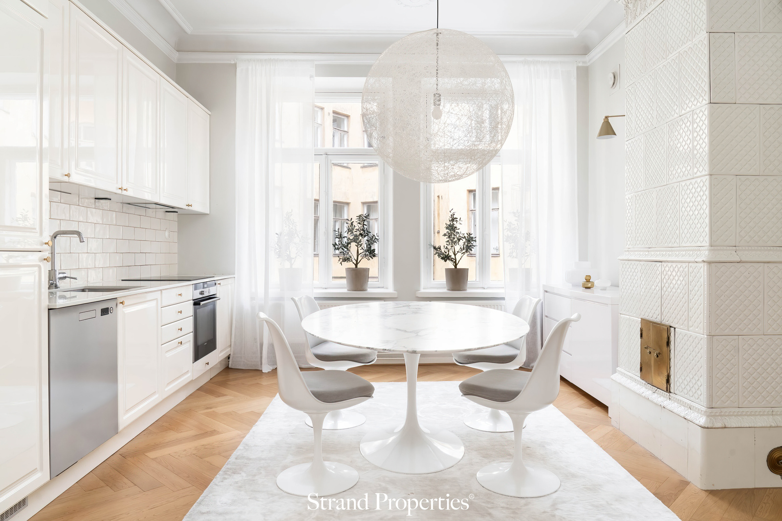 Tämä upea koti sijaitsee vuonna 1897 valmistuneessa arvokiinteistössä, jonka historiallinen arvokkuus yhdistyy saumattomasti moderniin asumiseen. Jo sisään astuessa alkuperäiset korkeat pariovet ja yksi kodin neljästä kakluunista toivottavat lämpimästi tervetulleeksi. Suuret ikkunat, syvät ikkunalaudat ja vaikuttava huonekorkeus tekevät asunnosta ilmavan. Massiiviset puuovet ja koristeelliset kattolistat viimeistelevät klassisen ilmeen. Asunto on remontoitu vanhaa kunnioittaen, laadukkailla materiaaleilla ja harkituilla ratkaisuilla.