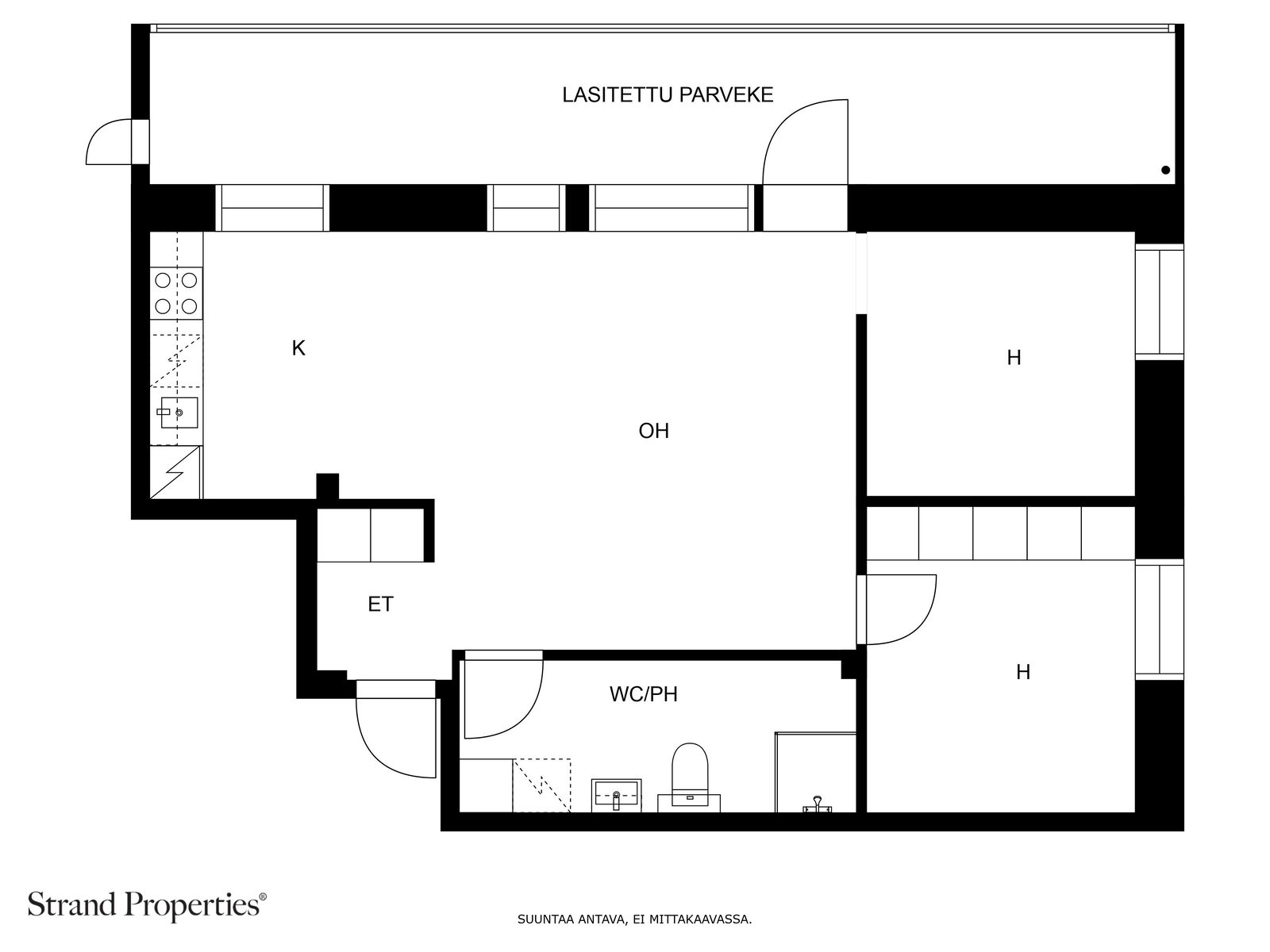Koko huoneiston mittainen, lasitettu parveke tarjoaa lisää oleskelutilaa ja jatkaa kodin tunnelmaa ulos asti. Viihtyisät sisäpihanäkymät.