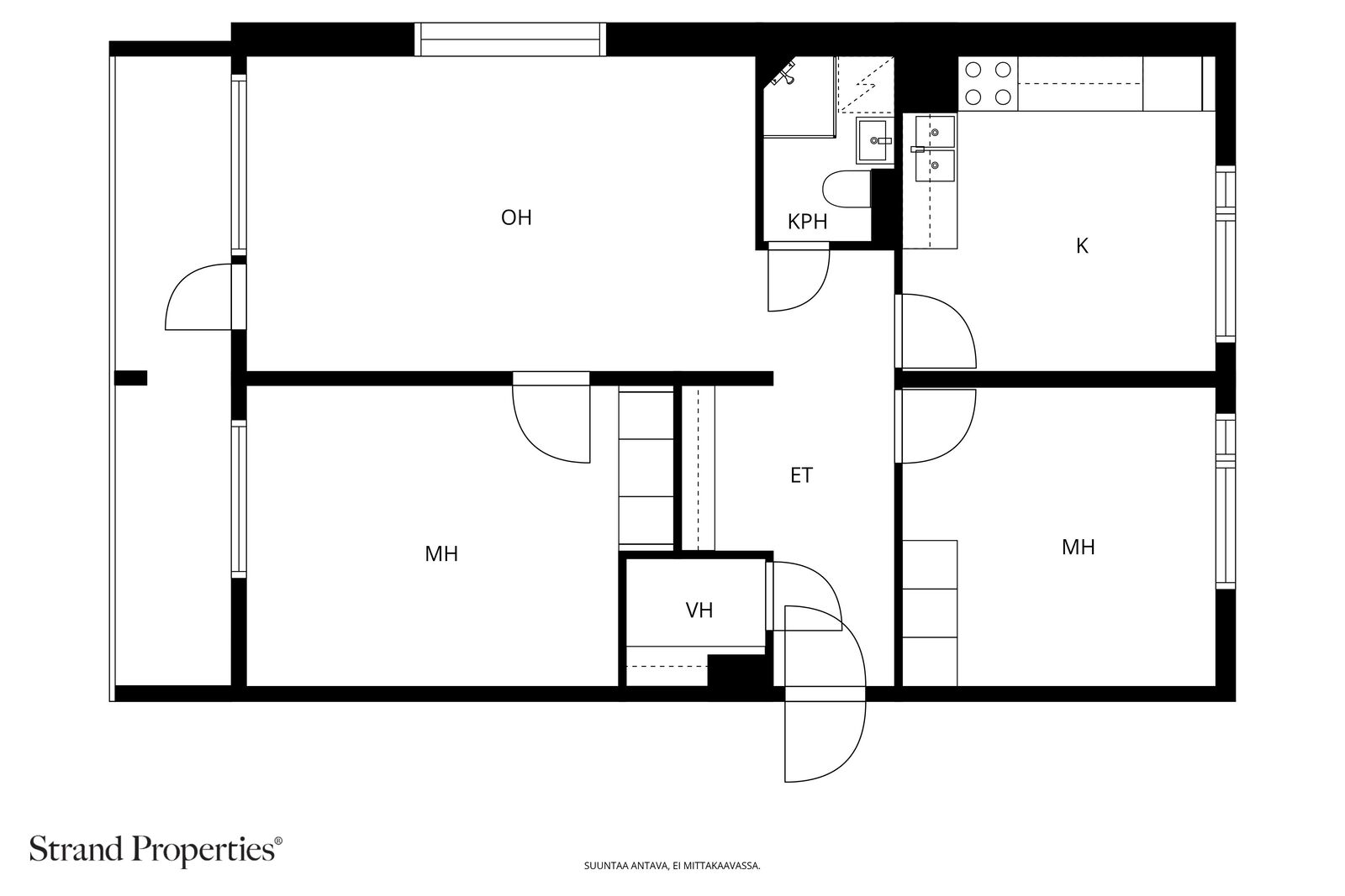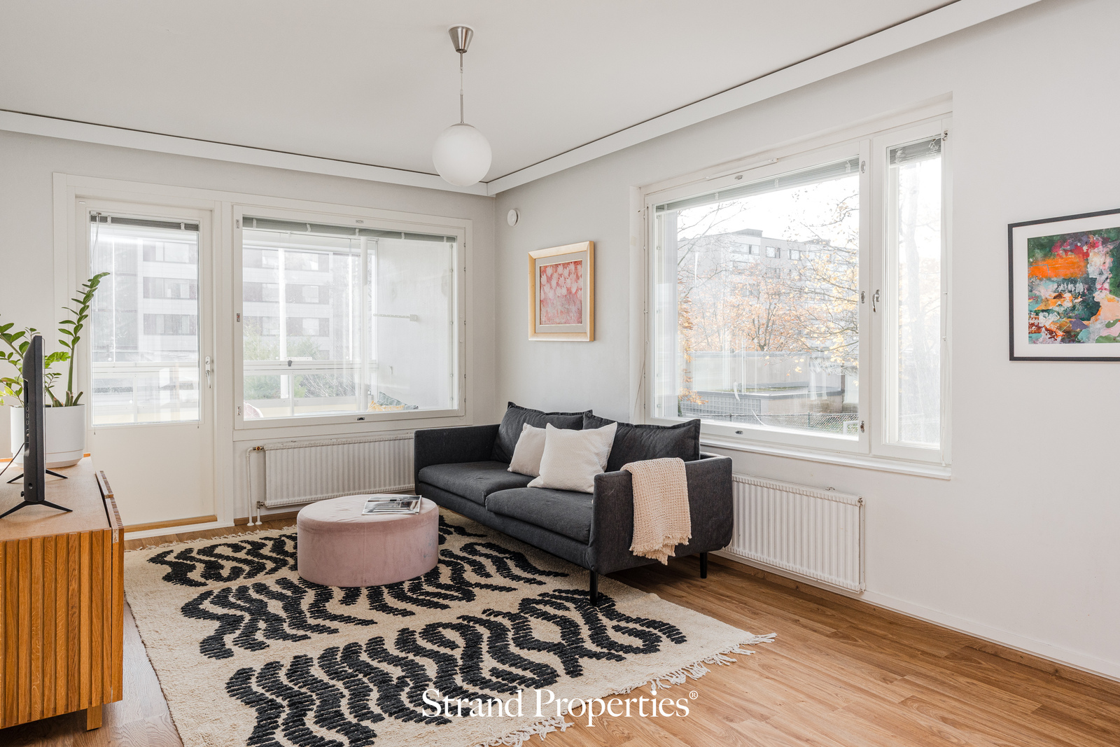Tämä koti sijaitsee yhtiön eteläisessä päädyssä ikkunoiden avautuessa kolmeen ilmansuuntaan. Täällä ensimmäinen asuinkerros on vain plussaa, yhdet portaat, ei minkäänlaista ohikulkevaa liikennettä ja vain yläkerran naapurit. Asunnon linjasaneerauksessa valmistunut kylpyhuone on modernin tyylikäs, silti parveke on se, joka saa sanattomaksi. Ennestäänkin koko asunnon levyinen tila on saanut lisäsyvyyttä juuri valmistuneessa julkisivuremontissa. Ehdottomasti upea lisähuone moneen käyttöön.