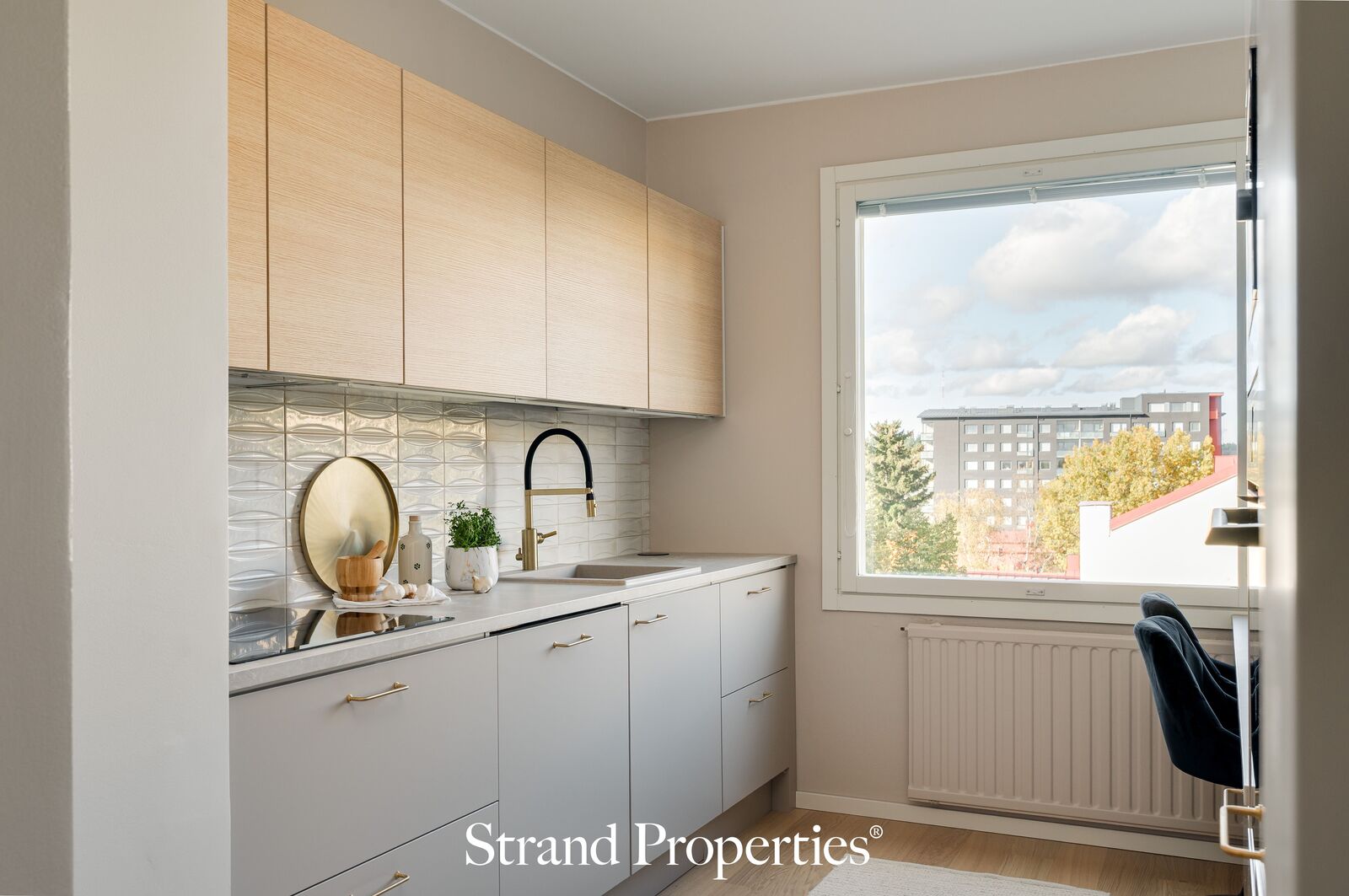 Tämä vastikään valmistunut koti hurmaa täysin uusilla ja käyttämättömillä pinnoillaan. Remontti on toteutettu tinkimättömällä maulla, jossa lämmin kovapuulattia ja harmoninen sävymaailma luovat seesteisen ja ajattoman tunnelman. Kauniit yksityiskohdat, kuten alkuperäiset vaatekaapit lankavetimineen ja säilytetyt väliovet, tuovat mukaan ripauksen menneen ajan eleganssia ja luonnetta. Koti on täynnä valoa ja ilmavuutta, joka korostaa sen hienostunutta viimeistelyä.