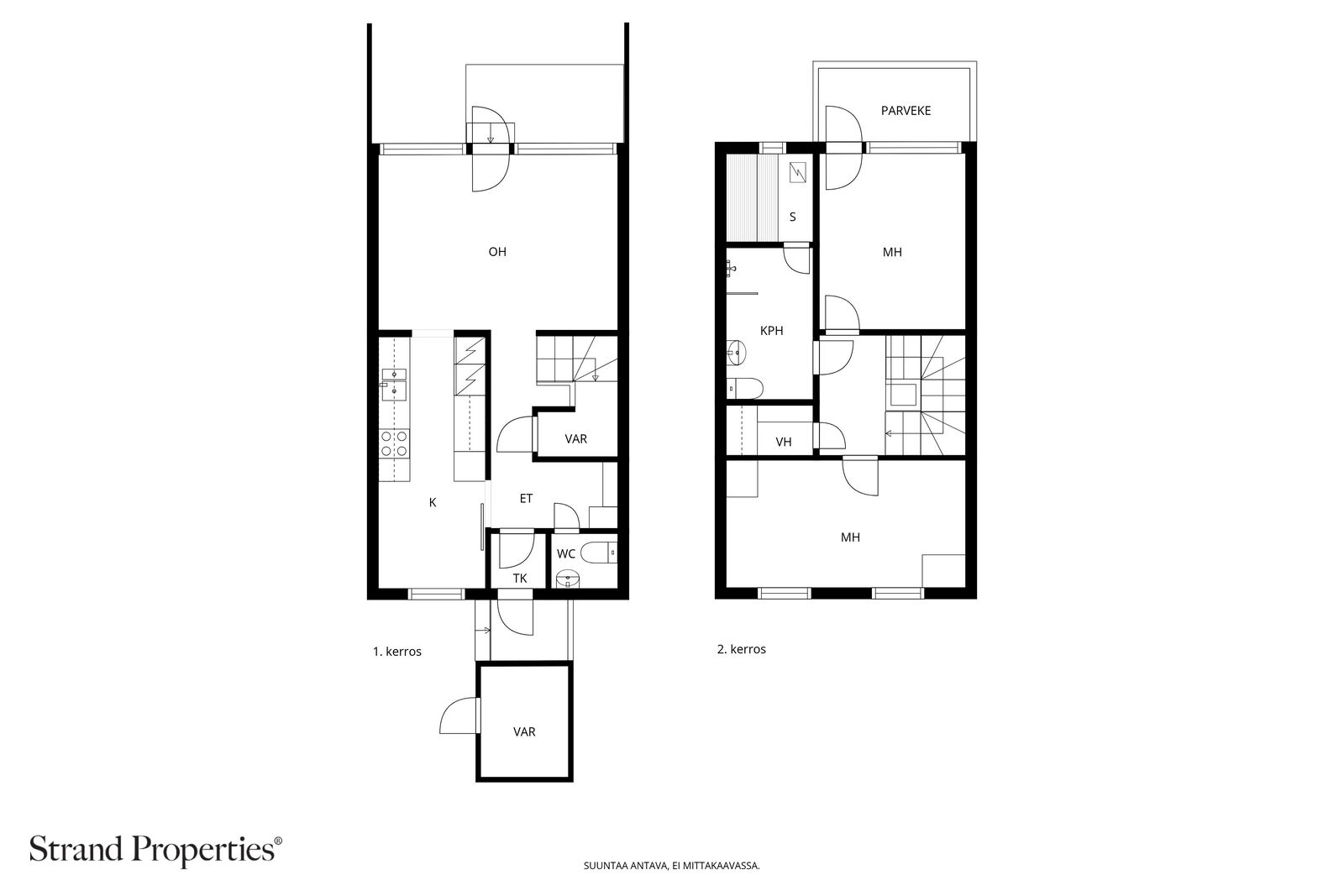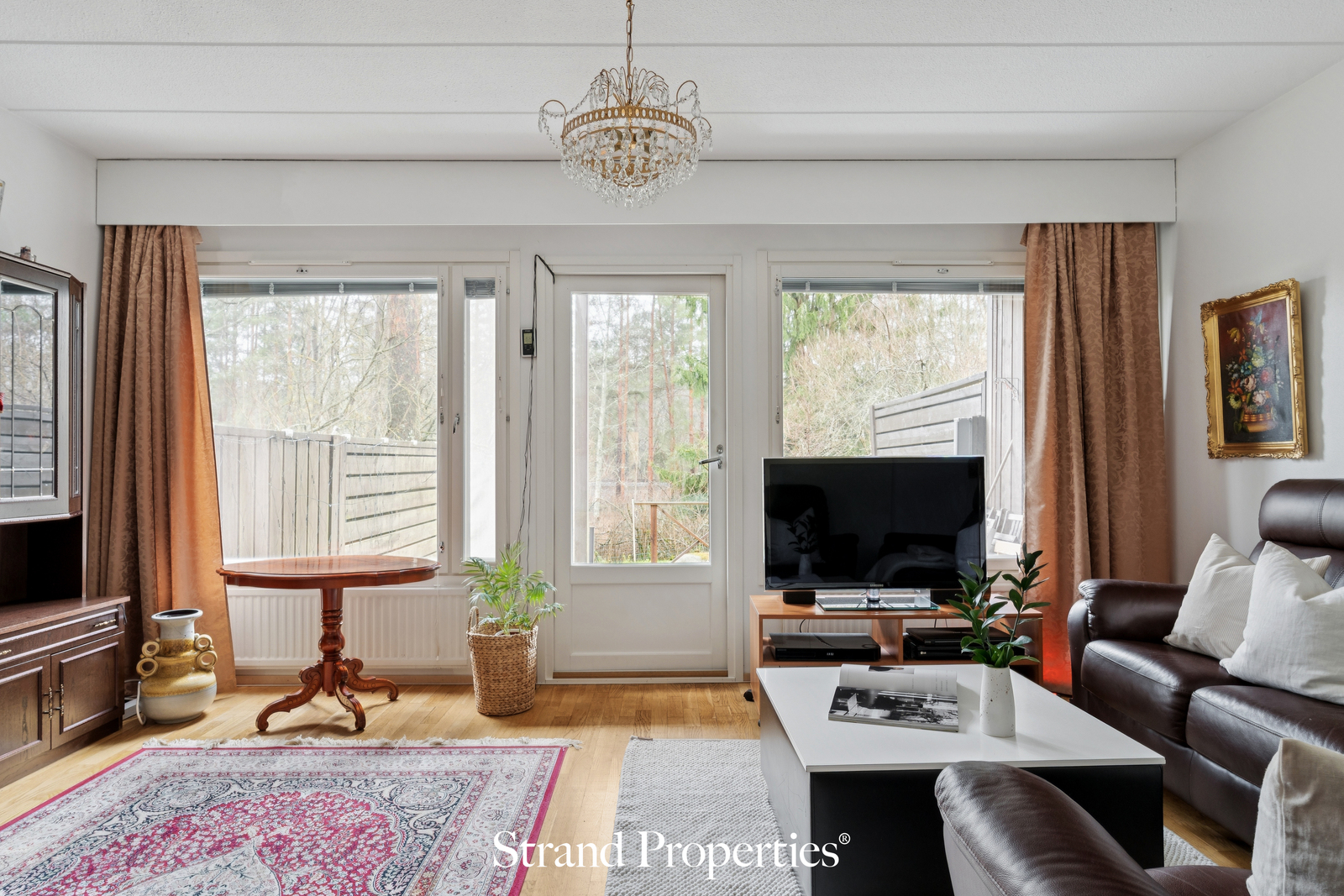 Tilat kahdessa kerroksessa. Asunnossa on tilavat makuuhuoneet ja saunaosasto yläkerrassa. Keittiössä valkoiset kaapistot, hyvin kaappi- ja säilytystilaa sekä tarvittavat kodinkoneet, lisäksi tilaa ruokailuryhmälle. Olohuone, takapiha ja lasitettu parveke ovat länteen. Vaatehuone ja portaiden alla komero, lisäksi ulkovarasto.