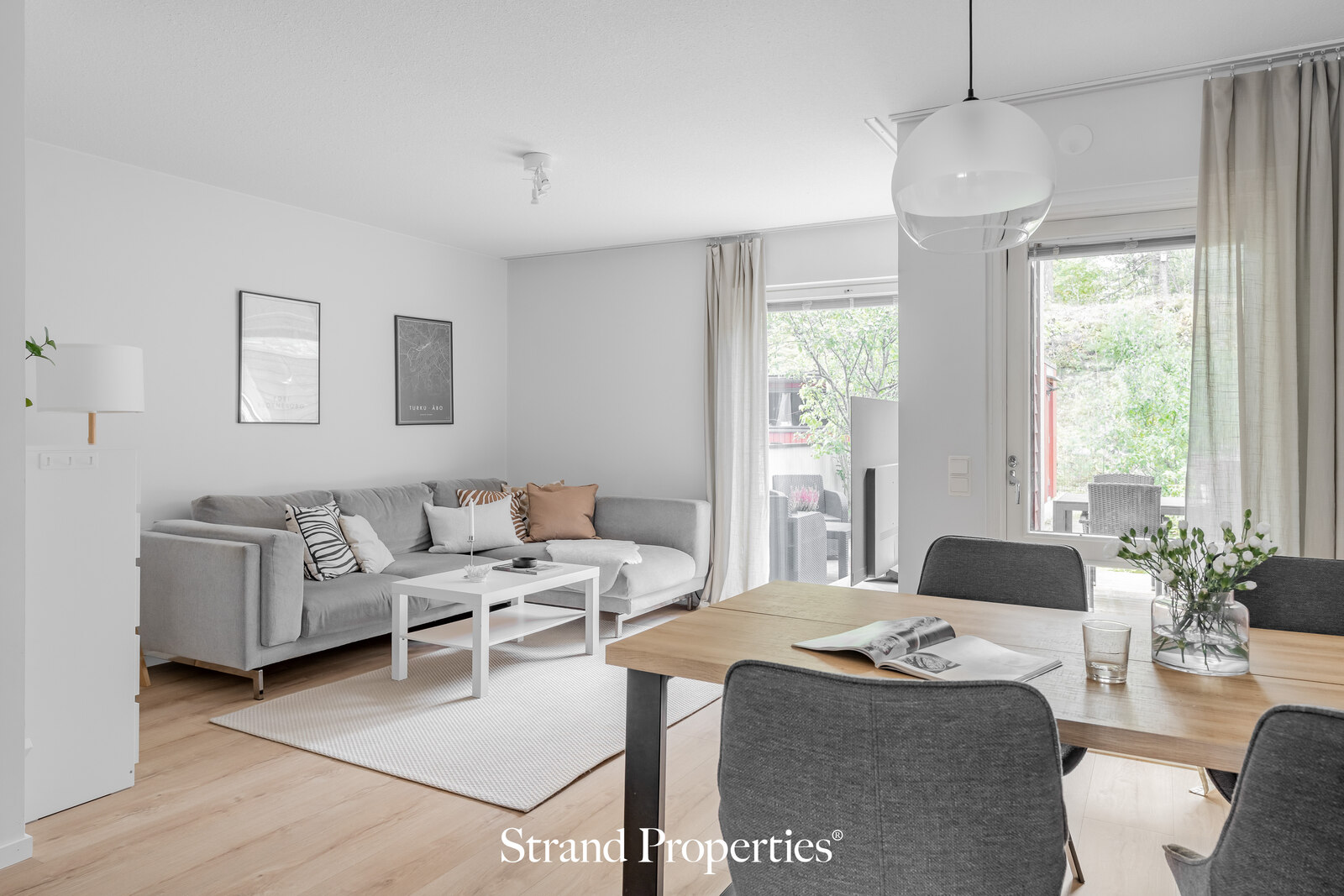 Piha on suojaisa, ja aivan vierestä löytyvät ulkoilureitit sekä yhtiön oma leikkipuisto. Käytännöllisyyttä tuovat hyvin suunnitellut säilytystilat ja huoneistolle kuuluva autokatospaikka. Sijainti palveluiden äärellä ja hyvien yhteyksien varrella tekee arjesta sujuvaa, samalla kun koti tarjoaa luonnonrauhaa ja yksityisyyttä.