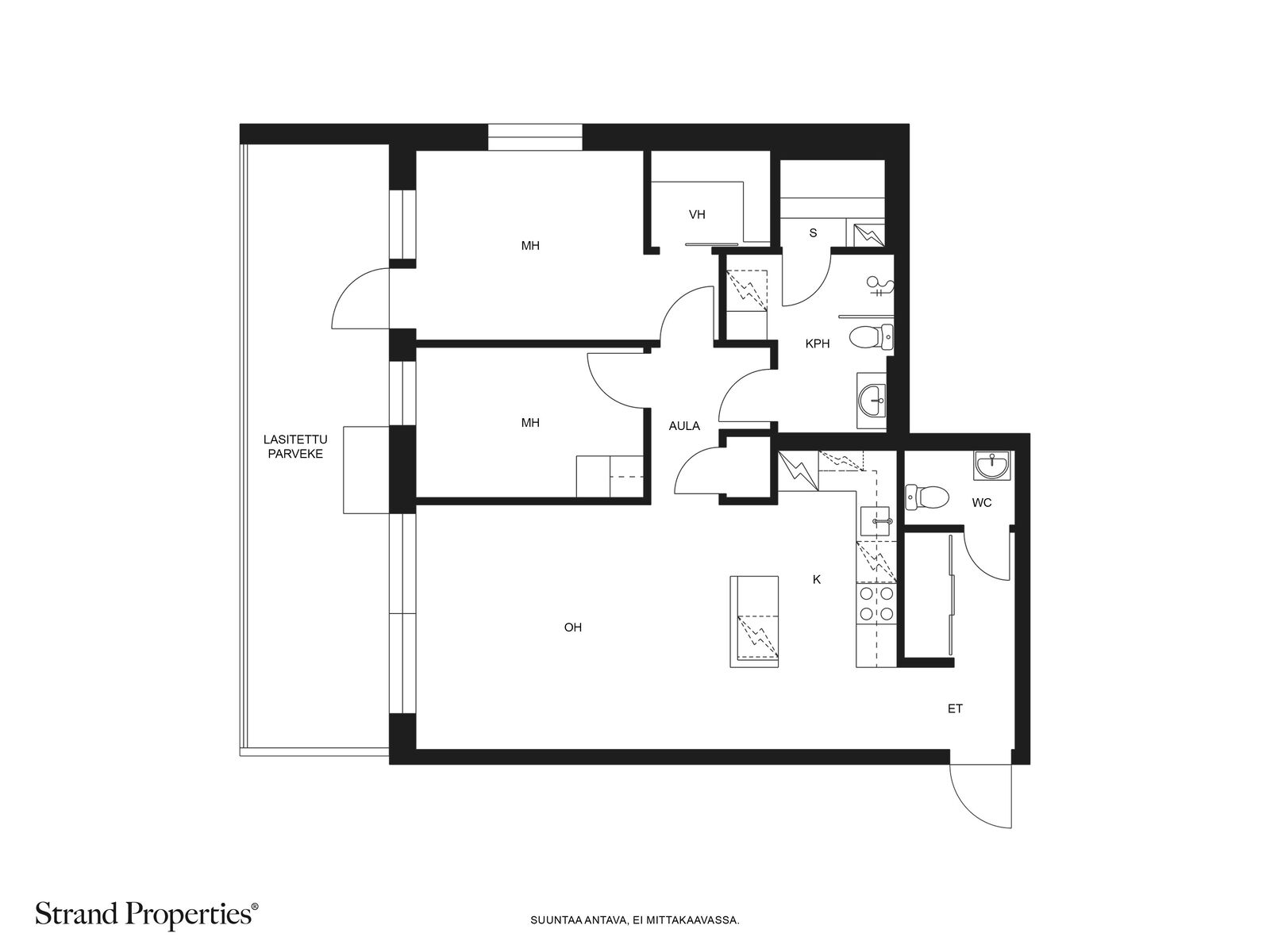 - huoneiston mittainen, lasitettu parveke merinäkymällä