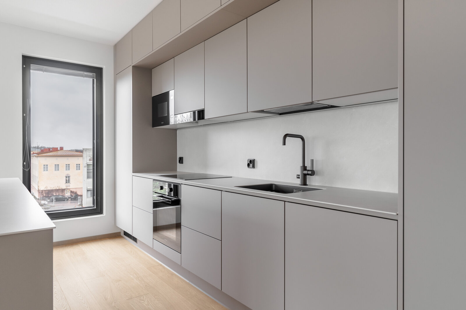 • Keittiön varustelu Keittiön työtasot ovat keraamista laattaa. Mielen laadukkaat kodinkoneet: integroitu jääkaappi, integroitu pakastin työtason alle, induktioliesi liesitasotuulettimella, erillisuuni, integroitu mikroaaltouuni ja astianpesukone. Lattia on tammiparkettia ja seinät on maalattu.