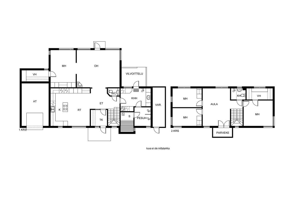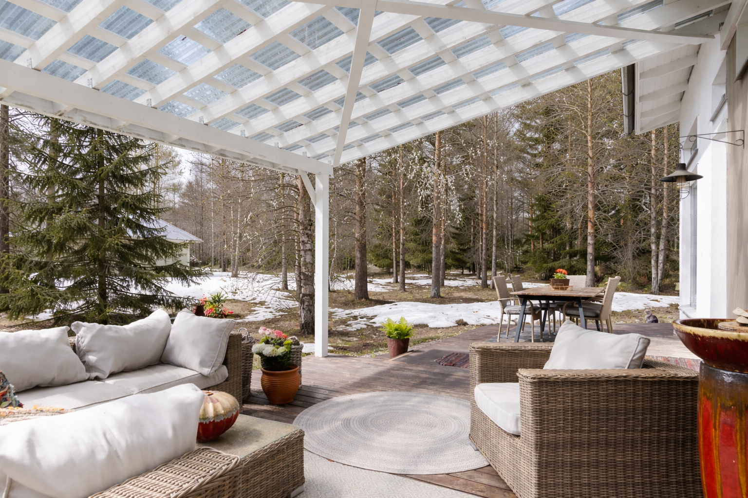Kodinhoitohuoneessa on käytännöllinen uloskäynti, ja perheen arkea helpottavat kaksi erillistä wc:tä sekä vaatehuone ja kylmä ulkovarasto. Autotalli ja laajennettu valokatettu terassi tarjoavat lisämukavuutta niin arkeen kuin juhlaan.