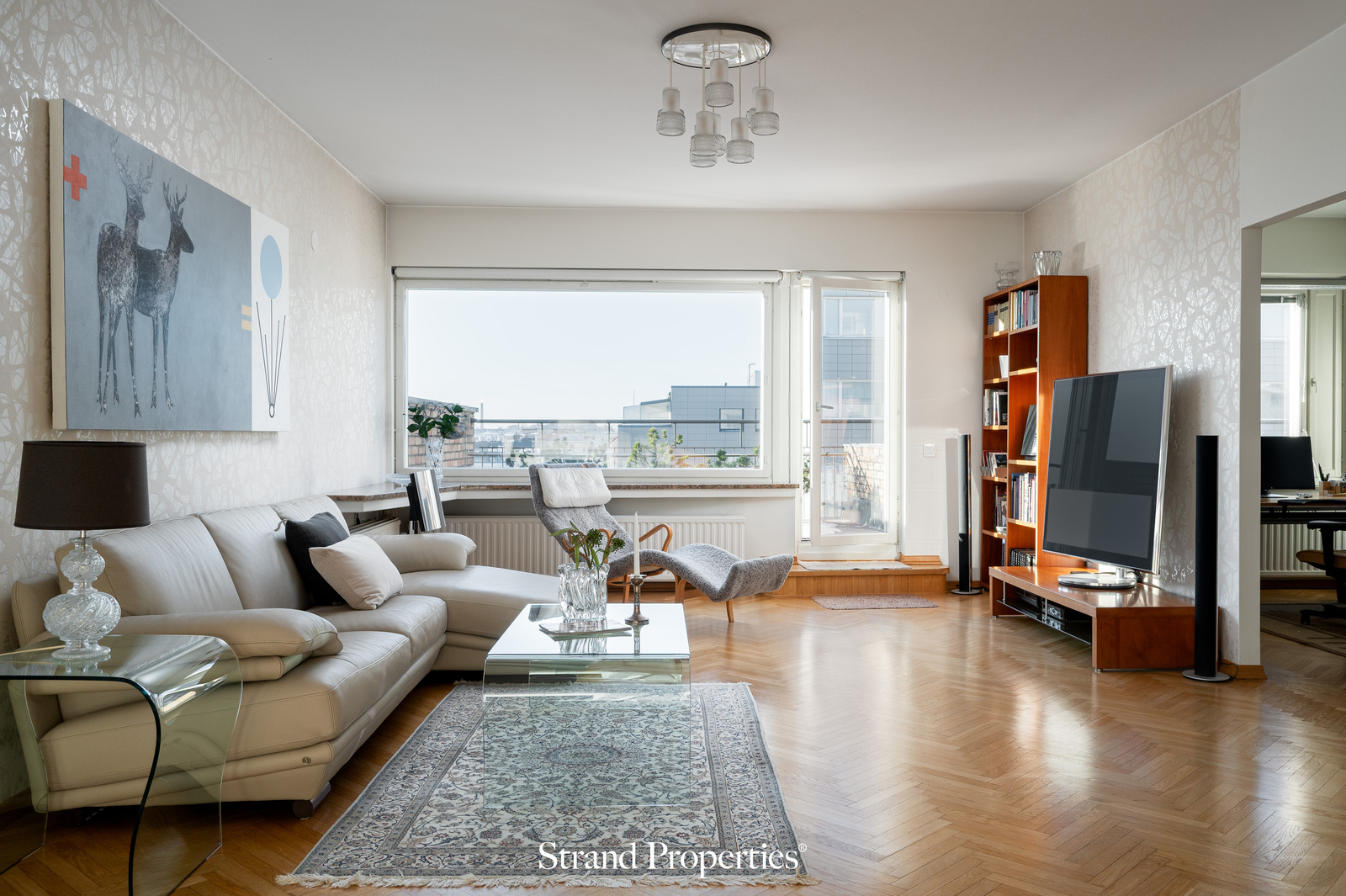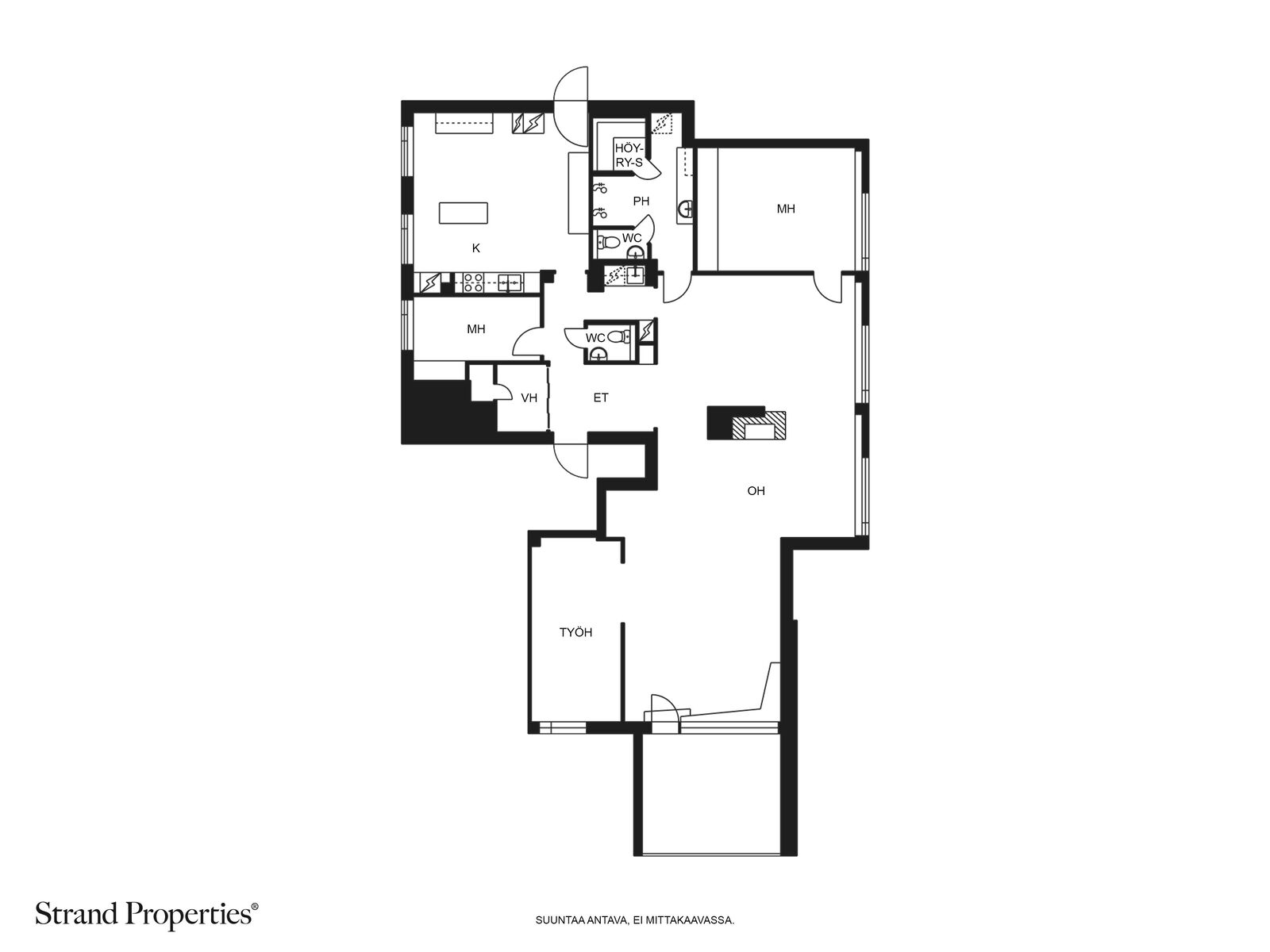 Selkeä ja avara pohjaratkaisu palvelee luontevasti niin arkea kuin juhlaa. Kolme makuuhuonetta sijoittuvat rauhallisesti eri puolille huoneistoa. Yksi makuuhuoneista toimii nyt työtilana olohuoneen yhteydessä, muttta on helposti muunneltavissa tarpeiden mukaan.