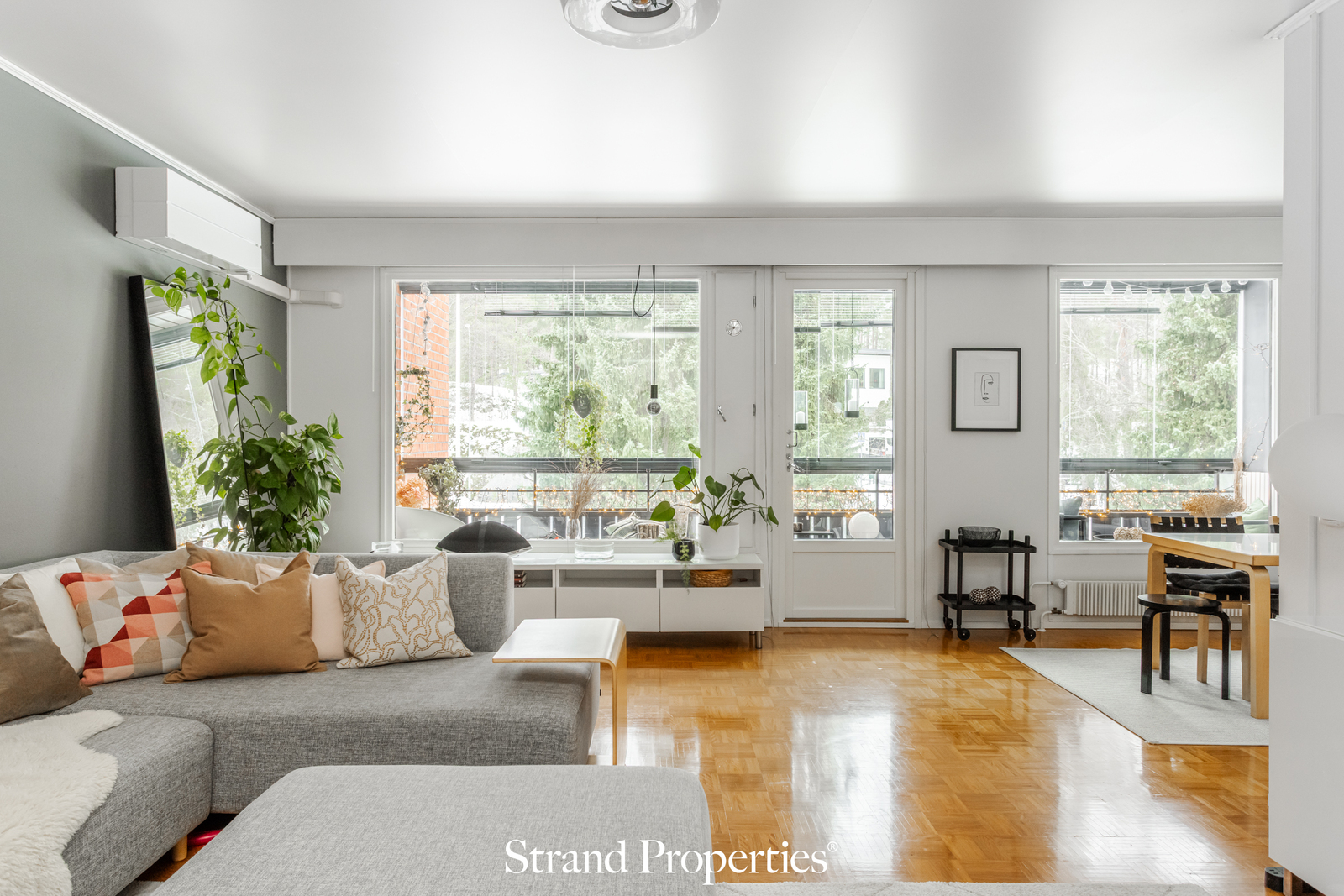 Olohuoneesta ja ruokailutilasta on saatu houkuttava, valoisa ja ilmava kokonaisuus. Alkuperäinen Mecrusse- parketti, stretch- katto ja suuret ikkunat tuovat tuulahduksen vuosien taakse. Suuri, lännen suuntaan oleva lasitettu parveke toimii kesäisin tilan jatkeena.
