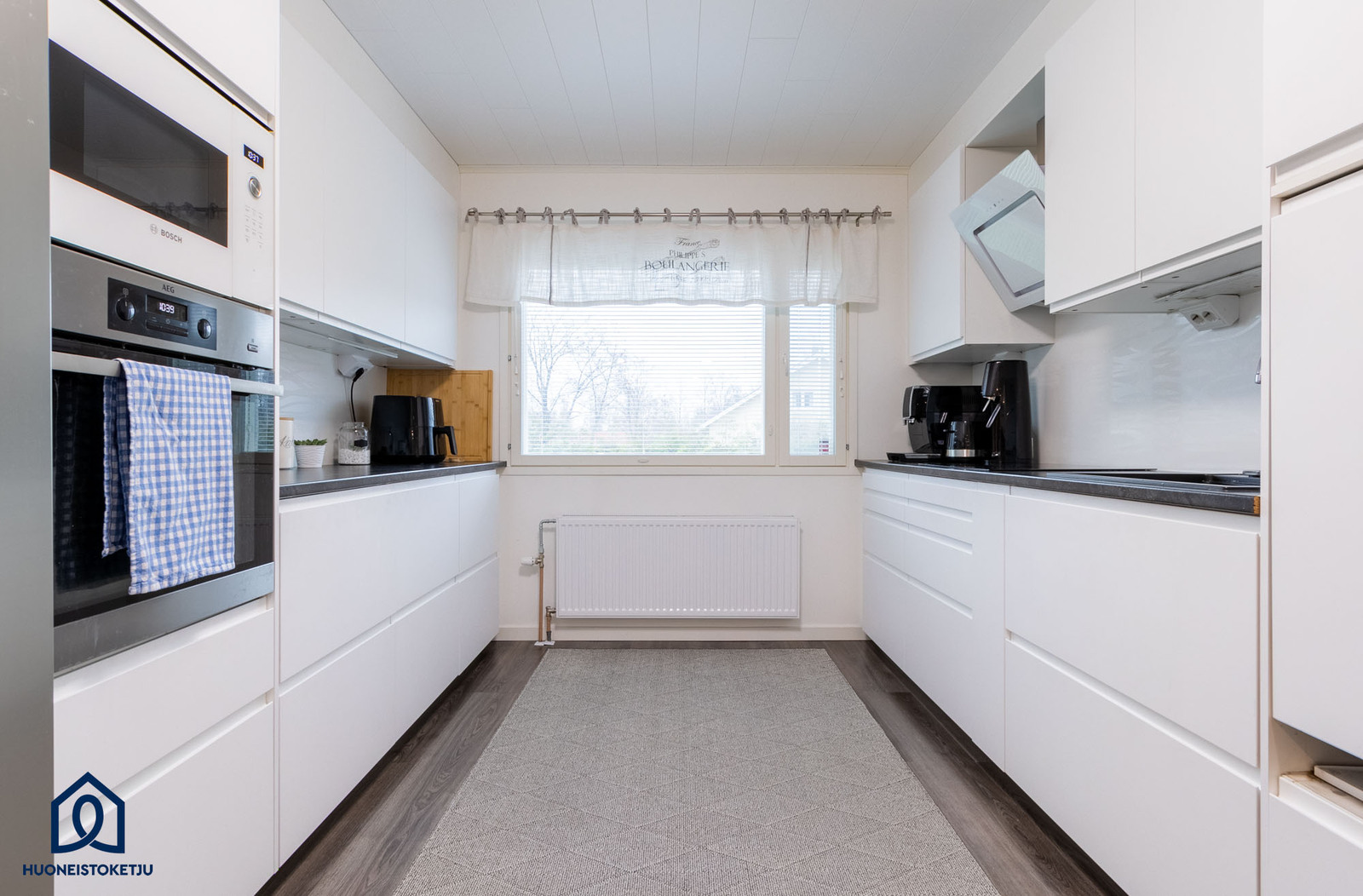 Talon sydän, keittiö, on varustettu nykyaikaisilla kodinkoneilla ja se muodostaa yhdessä valoisan olohuoneen kanssa viihtyisän tilan perheen yhteisille hetkille. Lattiat laminaattia ja seinät maalattu, mikä tekee tiloista valoisat ja helposti muunneltavat omaan makuun sopiviksi.