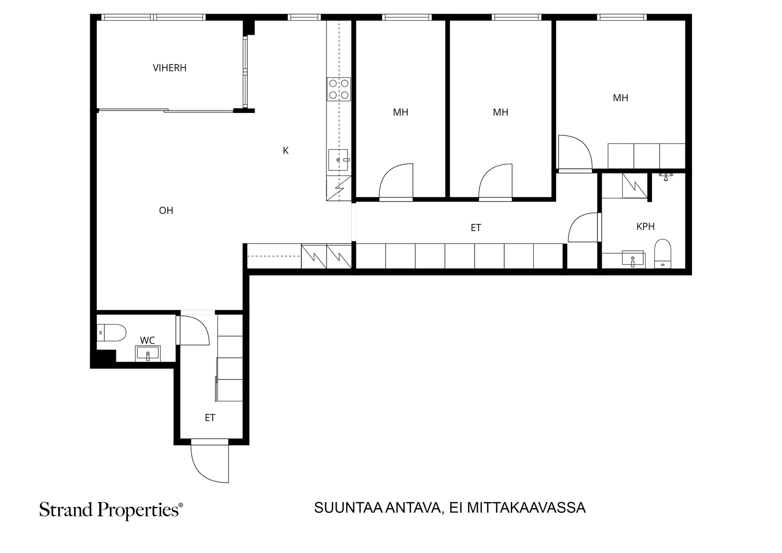 Kolme tilavaa makuuhuonetta sijaitsevat käytännöllisesti omassa rauhassaan asunnon toisessa päädyssä, erillään oleskelutiloista. Tämä selkeä tilajako tuo arkeen toimivuutta ja tarjoaa omaa rauhaa. Pitkät kaappirivistöt mahdollistavat runsaasti säilytystilaa ja tekevät kodin pitämisestä järjestyksessä vaivatonta. Kaksi erillistä wc-tilaa, joista toinen kylpyhuoneen yhteydessä, lisäävät asumismukavuutta koko perheelle.