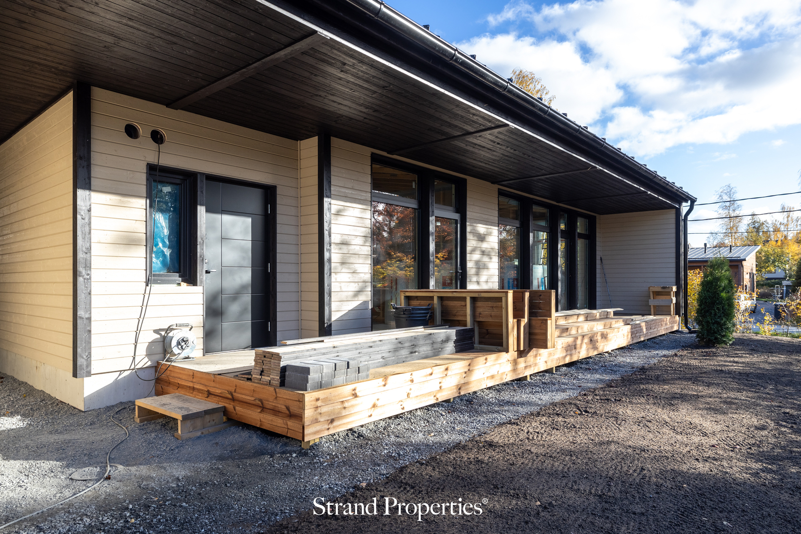 Täällä arki on helppoa, valoisaa ja kaunista – juuri niin kuin sen kuuluukin olla. Rakennus on tyylikkäästi tumma ja sopii hyvin alueelle luoden tyylikkään ja näyttävän kokonaisuuden.