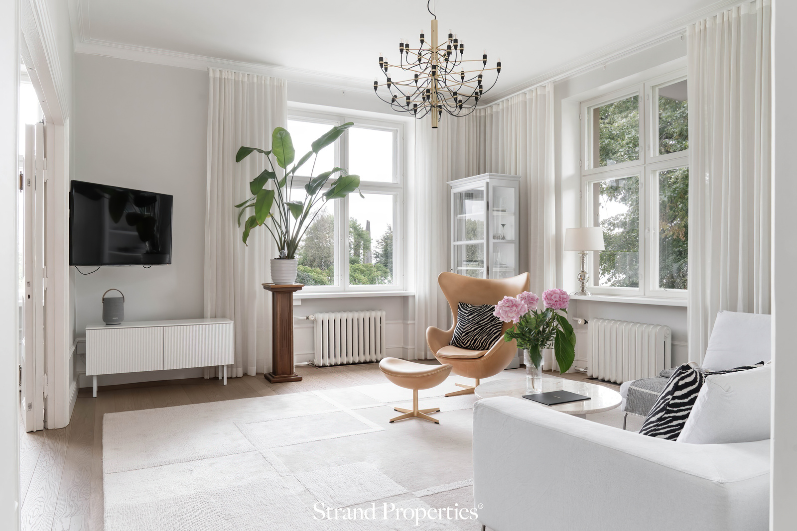 Comprehensively renovated between 2019 and 2021, this home features three bedrooms, one of which includes a beautiful and functional tiled fireplace. The kitchen and living room open toward the sea. The corner living room faces both south and west, offering tranquil views over the open sea as well as the charming park that descends from Engel Square. The renovation has provided the apartment with ample additional storage space.