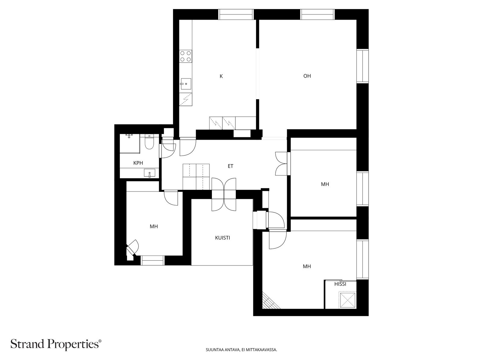 The home exudes the dignity of a bygone era. High ceilings, original doors, and intricate wall and ceiling decorations create a unique atmosphere. The building stands on a slope surrounded by a beautiful, fenced garden with mature plantings. The property offers the peace and privacy of a detached home, with only one apartment per staircase and two separate entrances to the residence. A large terrace built atop the wall beneath the apartment’s windows invites you to relax and enjoy the sea breeze. The housing company is well maintained, with no major renovations planned.